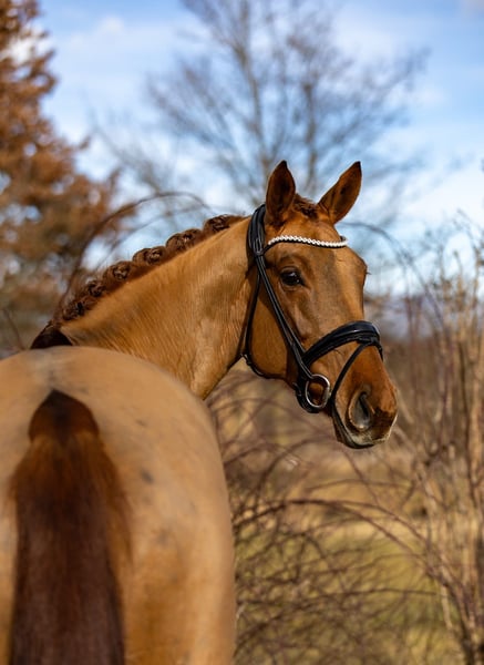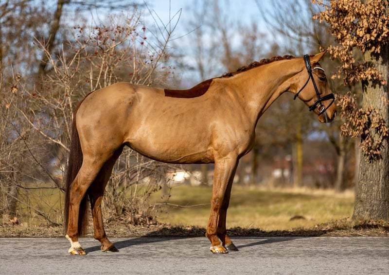Fantastic Amber ist eine sechsjährige Dunkelfuchsstute mit Ausstrahlung, Qualität und klarer Perspektive. Bereits jetzt präsentiert sie sich als modernes Dressurpferd mit drei sehr guten Grundgangarten, natürlicher Balance und ausgeprägter Rittigkeit. Sie ist absolut unkompliziert zu reiten, geht in leichter, konstanter Anlehnung und entwickelt dabei stets einen schwungvollen, aktiven Bewegungsablauf mit deutlicher Bergauf-Tendenz. Besonders hervorzuheben ist ihre bemerkenswerte Versammlungsbereitschaft: Bereits im Galopp zeigt sie sehr gutes Lastaufnahmevermögen bei gleichzeitig stabiler Selbsthaltung. Fantastic Amber vermittelt ein sicheres, sehr angenehmes Reitgefühl. Durch ihre klare Struktur im Körper und ihre natürliche Durchlässigkeit lässt sie sich einfach regulieren und weiter fördern. Sie ist leistungsbereit, aufmerksam und arbeitet mit einer positiven Grundeinstellung. Mit einem Stockmaß von ca. 1,66 m besitzt sie eine praktikable Größe und bietet damit beste Voraussetzungen für unterschiedliche Reiterkonzepte. Sowohl ambitionierte Dressurreiter auf der Suche nach einem hochwertigen Nachwuchspferd als auch solide Reiter auf sicherem A-Niveau finden in ihr eine verlässliche, perspektivische Partnerin. Auch im täglichen Umgang überzeugt sie durch ihr unkompliziertes Wesen. Sie ist freundlich, zutraulich und sehr angenehm im Handling – ob beim Putzen, beim Schmied oder in neuen Situationen. Fantastic Amber behält stets einen klaren Kopf und zeigt sich nervenstark sowie kooperativ. Eine qualitätsvolle Nachwuchsstute mit klarer sportlicher Zukunft. Standort des Pferdes: Rosenheim