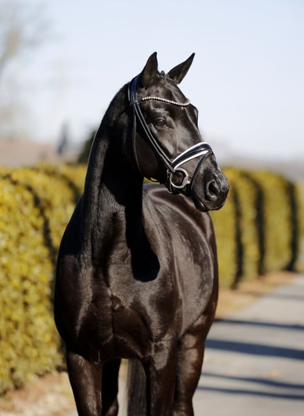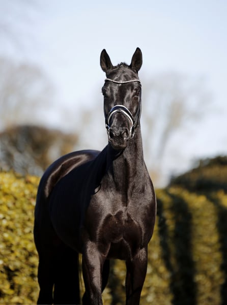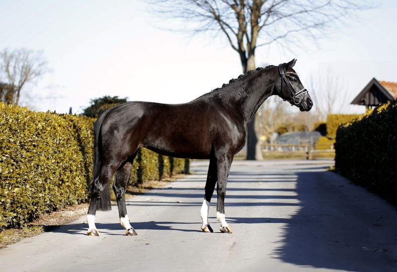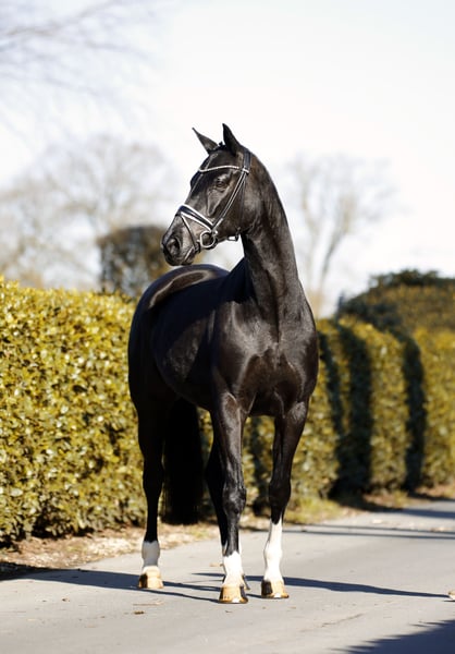 Lśniąca czarna klacz do ujeżdżenia z czterema białymi skarpetkami i złotym serduszkiem! To wysokiej jakości, elegancka i absolutnie odważna młoda klacz, którą można łatwo prowadzić i z którą można pracować bez problemu. Dotychczas była trenowana głównie rekreacyjnie i sporadycznie, jednak posiada wyraźny potencjał na wyższy poziom. Kompaktowa, niewykorzystana jeszcze koń do jazdy, która codziennie cieszy i sprawia radość. Aktualne badanie techniczne.