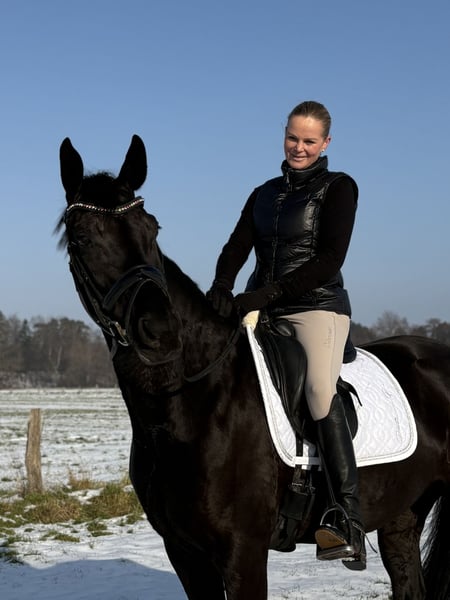 This mare combines top quality with an outstanding dressage pedigree. Bred from Fürstenball x Weltmeyer, she carries excellent performance bloodlines – a jet-black gem that is also highly interesting from a breeding perspective. She has already been placed in Dressage Horse A, and that was at only her second competition. The mare is very easy to ride, fearless, and impresses with a very expressive trot, generous overtracking, and three expressive basic gaits. With a friendly temperament and an estimated height of around 1.70 m, she is still fully developing and is expected to continue to improve positively. A highly promising dressage prospect for the upcoming season. Extremely light-footed, clear-minded, and easy to handle. Her TÜV was excellent at one year old, but of course, it needs to be renewed! She has never been ill or showed any abnormalities. Always healthy and in perfect condition.