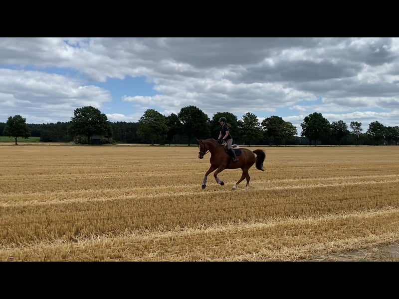 Diese charmante 6-jährige Stute besticht durch ihren ausgeglichenen Charakter und ihre Vielseitigkeit: Ob Dressur, Springen oder Gelände – sie zeigt sich in allen Bereichen talentiert und motiviert. Sie springt problemlos einen kleinen Parcours inkl. Unterbauten und Wassergraben und beherrscht in der Dressur die Lektionen der Klasse A. Schonend angeritten, hatte sie zunächst ein Fohlen (kann besichtigt werden) und wurde anschließend behutsam und mit viel Ruhe wieder an die Arbeit unter dem Sattel herangeführt. Dabei hat sie sich stets kooperativ und lernwillig gezeigt. Sie springt erste fliegende Wechsel und hat mit Außengalopp begonnen. Im täglichen Umgang ist sie ein absoluter Schatz – brav beim Schmied, unkompliziert beim Verladen und angenehm im Stall. Sie ist sozial verträglich mit anderen Pferden, geht aber auch selbstbewusst allein ins Gelände. Ein ideales Pferd für ambitionierte Freizeitreiter*innen oder die weitere sportliche Ausbildung. Aus dem Mutterstamm sind bereits einige erfolgreiche Pferde und Auktionsfohlen hervorgegangen. So zum Beispiel Dione v. De Niro - erfolgreich bis zum Grand Prix. Aktuelle gute Röntgenbilder mit einem Chip (VR) liegen vor und können eingesehen werden. Probereiten nach Absprache möglich.