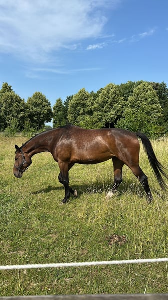 Liebe Dressurreiterinnen und Pferdeliebhaber, oder Voltigierer. Im Auftrag meines guten Freundes steht seine 6jährige Hannoveraner Stute zum Verkauf. Da er selbst beruflich (selbständig) stark eingespannt ist, zwei Pferde hat und auch mit 63 jetzt in jeder Hinsicht kürzer treten möchte, hat er mich gebeten, seine junge Stute hier zu inserieren. Ich habe Bilder und Videos hochgeladen und auch Teile des Equidenpasses. Die Stute ist 6 Jahre alt, großrahmig, hat ein Stockmaß von 181 cm und wiegt aktuell 714 kg. Sie wird von einem erfolgreichen Grand-Prix-Reiter ausgebildet und steht momentan auf L-Niveau und hat definitiv Potential nach oben. Sie ist nervenstark, gangfreudig, arbeitsfreudig, lieb vom Wesen und im Umgang, lässt sich sehr gut reiten, ohne zu steigen oder zu buckeln. Sie geht auch nicht durch. Dennoch ist sie kein Anfängerpferd und kein Kinderpferd. Sie hat go (absolut kontrollierbar) und will arbeiten. Das Stütchen ist geimpft, hat vorne Eisen, (barhuf ginge bei ihr auch), ist entwurmt, kennt natürlich alle Basics und sowohl Boxenhaltung, als auch Paddock und Weide. Die Stute ist gesund und kann probegeritten werden. Da ich ein wenig vorsondiere, möchte ich Sie bitten, mich bei Interesse erstmal NUR via WhatsApp Nachricht zu kontaktieren, damit wir ein Telefonat zeitlich absprechen können. Wenn Sie danach Interesse an einem Kennenlernen haben, gebe ich den direkten Kontakt zu meinem Freund weiter, so dass Sie mit ihm alles weitere besprechen können. Wenn Sie ein Pferd suchen, mit dem sie gemeinsam nach oben wachsen können, auch gern "weiter" nach oben, und dem sie dabei vertrauen können, weil es klar im Kopf ist und einen guten Charakter hat, dann lohnt sich die erste Kontaktaufnahme in jedem Fall. Sie erreichen mich für eine erste Textnachricht hier: 0171-3484513 (Tanja Küsters) Mein Freund wohnt in Köln und dort steht auch seine Stute.