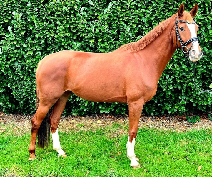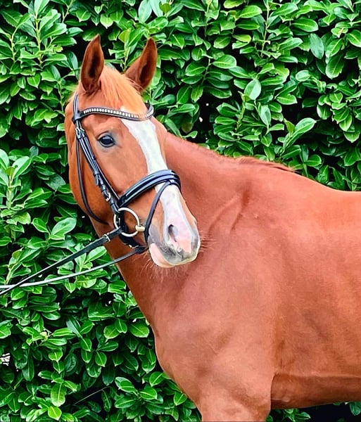 Vella is a 7-year-old state premium mare who had a foal by Duplexx when she was 6 years old. She was gently backed at the age of 4 and was already able to place highly in show jumping classes A and L at the age of 5, and this year she was able to pick up right where she left off after her break. Vella not only excels in jumping but also possesses good basic gaits, allowing her to be successful in dressage with appropriate training. Vella is very well-behaved both in handling and under saddle, and she has a pleasant go. Weaker riders are no problem for her. Of course, she is also well-behaved in the field, whether going out alone or in a group. Vella is good for the farrier and loading. Unfortunately, she does crib, but it does not cause her any issues.