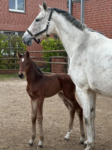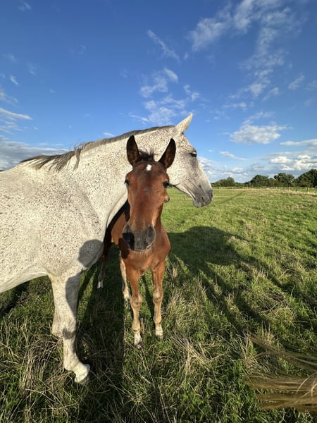 Fattrice con puledro del 06.05.2025 e nuovamente gravida per il 2025 da Chicago Blue Kalotta M è una bellissima, affettuosa e socievole fattrice. Viene venduta a causa di una vasta prole. Kalotta ha dato alla luce un fantastico puledro alto e slanciato da Chicago Blue VDL (Chacco-Blue x Cento) il 06.05.2025 (nella foto nel paddock a 1 giorno, nella foto Wiede a 1 settimana, nei video a 2 giorni). Attualmente è nuovamente gravida da Chicago Blue, la visita del 03.06.2025 è stata positiva. Kalotta ha già avuto due ottimi puledri (da Esmeraldo e da Chicago Blue). Dal ceppo materno sono già emersi diversi cavalli da salto di successo fino alla classe S. Purtroppo, Kalotta si è infortunata da puledra, quindi c'è una refertazione radiografica sulla zampa anteriore sinistra, altrimenti non ci sono stati riscontri. Kalotta non è stata montata per questo motivo. La fattrice trascorre l'inverno in gruppo su un paddock asfaltato con mangiatoie per fieno e di notte nella stalla. In estate è abituata a pascolare tutto il giorno. È cresciuta in questo modo, l'ho allevata personalmente. Nella foto con i 3 grigi, si vede Kalotta M (tutto a destra) con le sue sorellastre. La fattrice e il puledro possono essere acquistati anche singolarmente. Prezzo fattrice 15.000 EUR (gravida per il 2026) + puledro del 06.05.2025 per 8.000 EUR (ciascuno incl. 19% IVA).