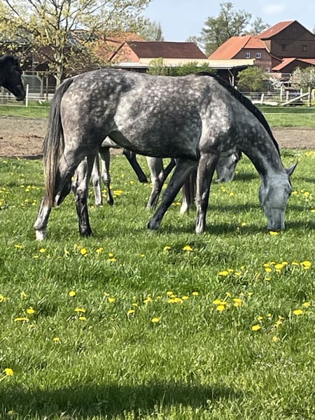 Stute von Karajan x Casino Berlin tragend für 2026 von Chicago Blue VDL Kalotta M ist eine bildschöne, liebe und menschenbezogene Stute. Sie wird wegen umfangreicher Nachzucht verkauft. Kalotta hat am 06.05.2025 ein tolles, langbeiniges HF von Chicago Blue VDL (Chacco-Blue x Cento) zur Welt gebracht. Aktuell ist sie wieder tragend von Chicago Blue VDL, TU am 03.06.2025 war positiv. Zu Chicago Blue VDL von Chacco Blue x Cento x Chin Chin: Chacco Blue, schon jetzt eine Legende, mit dem 3. Platz im großen Preis von Aachen sorgte der Sohn des Chambertin sportlich für Aufsehen. Die Mutter Cella führte 2013 die WBFSH-Liste der erfolgreichsten Springpferde der Welt an. Neben zahlreichen Großen Preisen, die Cella unter Ben Maher gewinnen konnte, ist der Vize-Europmeister Titel eines der herausragendsten Ergebnisse dieses Paares. Auch der Sieg im Preis von Europa in Aachen war eines der Highlights ihrer Karriere. Ben Maher beschreibt seine Cella als "eine wahre Kämpferin, die bei guter Laune nicht zu schlagen war". Der Muttervater Dobel´s Cento v. Capitol I ist einer der bekanntesten Helden des Deutschen Springsports, er gewann unter Otto Becker 2000 den Großen Preis von Aachen, wurde mit dem Deutschen Team Europameister und Olympiasieger. Die Großmutter von Chicago Blue ist ebenfalls eine Berühmtheit, Usha van't Roosakker. Die unter Marlon Modolo Zanotelli in 1,50-Springen erfolgreiche Stute, ist die Linienbegründerin des weltweit so begehrten "Roosakker"-Stammes. Kalotta hatte bereits drei tolle Fohlen (von Esmeraldo und zwei von Chicago Blue VDL) und hat immer sofort wieder aufgenommen. Aus dem Mutterstamm sind bereits mehrere bis Klasse S*** erfolgreiche Springpferde hervorgegangen (incl. Teilnahme am Weltcupfinale in Riad 2024). Kalotta hatte sich leider als Fohlen verletzt, daher gibt es einen Röntgenbefund vorne links, ansonsten gab es keinerlei Befunde. Geritten wurde Kalotta aus dem Grund nicht, sie ist aber lahmfrei. Die Stute steht im Winter in der Gruppe auf einem befestigten Paddock mit Heuraufen und nachts in der Box. Im Sommer ist sie ganztägige Weidehaltung gewohnt. Genauso ist sie auch aufgewachsen, ich habe sie selbst gezogen. Auf dem Bild mit den 3 Schimmeln ist Kalotta M (ganz rechts) mit ihren Halbschwestern zu sehen.
