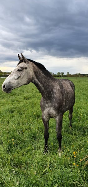 Kalotta M is a beautiful, affectionate, and people-oriented mare. She is being sold due to extensive breeding. Kalotta is currently in foal to Chicago Blue VDL (Chacco-Blue x Cento), with a due date in April 2025. Kalotta has already had two wonderful foals (by Esmeraldo and by Chicago Blue). Several successful show jumpers up to class S have already emerged from her maternal line. Unfortunately, Kalotta sustained an injury as a foal, which is why there is an X-ray report for her left front leg; otherwise, there have been no findings. For this reason, Kalotta has not been ridden. The mare spends the winter in a group on a solid paddock with hay racks and is in a box at night. In the summer, she is used to being out on pasture all day. This is also how she was raised; I have raised her myself. In the picture with the three greys, Kalotta M (far right) is shown with her half-sisters. The mare and foal can also be purchased separately (Price: Mare 12,000 EUR + Foal 8,000 EUR, each including 19% VAT).