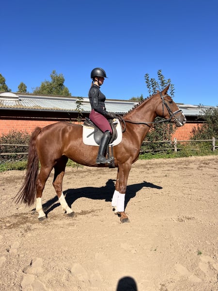 Elegant Hanoverian mare for sale – ideal for dressage! This beautiful chestnut mare was foaled in 2018 and impresses with her attractive appearance and gentle temperament. Standing at 16.1 hh, she offers the perfect size for ambitious riders looking to develop their dressage skills. Her friendly nature and willingness to learn make her suitable for both advanced riders and talented young riders aiming to progress. Please feel free to contact me for more information or if you are interested. Viewing and test rides can be arranged by appointment.