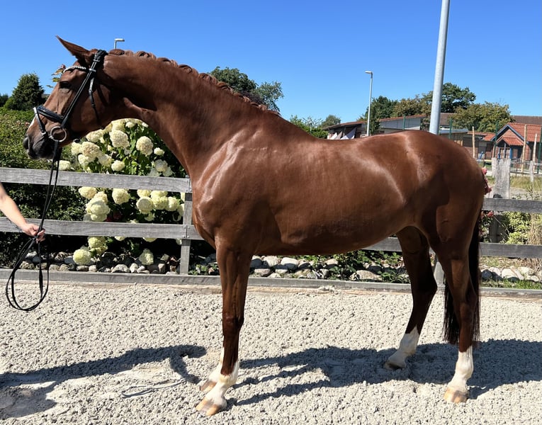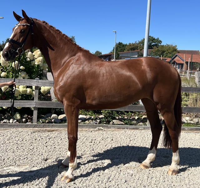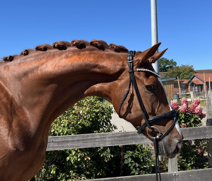For sale is a 6-year-old mare by Vitalis out of Wolkentanz, which we acquired as a foal at the Verden Foal Auction and have carefully trained. She had a very beautiful foal at 4 years old and has recently started competing in dressage competitions, placing in classes A, L, and M. Her flying changes are still developing, but she is on a good path. For insights into our daily work, please visit our Instagram account at Sportpferde_Gerdes. Characteristics & Quality: - Modern, large-framed horse with excellent basic gaits - Lots of go and sporting potential - Well-behaved, herd-compatible, familiar with terrain, indoor arena, outdoor arena, and competition atmosphere - Healthy and free of vices such as weaving or bucking Due to her quality and competition success, this horse would normally be valued in a significantly higher price segment. However, since she needs an experienced rider who can give her the necessary time and confidence, we are offering her at a more reasonable price. For further information, please call me at 0171 691 6368.