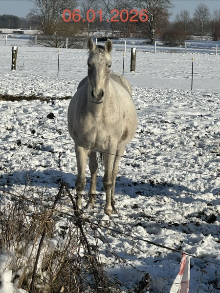 Stute von Karajan x Casino Berlin tragend für 2026 von Chicago Blue VDL (Abfohltermin 17.04.2026) Kalotta M ist eine bildschöne, liebe und menschenbezogene Stute. Sie wird wegen umfangreicher Nachzucht verkauft. Kalotta hat am 06.05.2025 ein tolles, langbeiniges HF von Chicago Blue VDL (Chacco-Blue x Cento) zur Welt gebracht. Aktuell ist sie wieder tragend von Chicago Blue VDL, TU am 03.06.2025 war positiv. Zu Chicago Blue VDL von Chacco Blue x Cento x Chin Chin: Chacco Blue, schon jetzt eine Legende, mit dem 3. Platz im großen Preis von Aachen sorgte der Sohn des Chambertin sportlich für Aufsehen. Die Mutter Cella führte 2013 die WBFSH-Liste der erfolgreichsten Springpferde der Welt an. Neben zahlreichen Großen Preisen, die Cella unter Ben Maher gewinnen konnte, ist der Vize-Europmeister Titel eines der herausragendsten Ergebnisse dieses Paares. Auch der Sieg im Preis von Europa in Aachen war eines der Highlights ihrer Karriere. Ben Maher beschreibt seine Cella als "eine wahre Kämpferin, die bei guter Laune nicht zu schlagen war". Der Muttervater Dobel´s Cento v. Capitol I ist einer der bekanntesten Helden des Deutschen Springsports, er gewann unter Otto Becker 2000 den Großen Preis von Aachen, wurde mit dem Deutschen Team Europameister und Olympiasieger. Die Großmutter von Chicago Blue ist ebenfalls eine Berühmtheit, Usha van't Roosakker. Die unter Marlon Modolo Zanotelli in 1,50-Springen erfolgreiche Stute, ist die Linienbegründerin des weltweit so begehrten "Roosakker"-Stammes. Kalotta hatte bereits drei tolle Fohlen (von Esmeraldo und zwei von Chicago Blue VDL) und hat immer sofort wieder aufgenommen. Aus dem Mutterstamm sind bereits mehrere bis Klasse S*** erfolgreiche Springpferde hervorgegangen (incl. Teilnahme am Weltcupfinale in Riad 2024). Kalotta hatte sich leider als Fohlen verletzt, daher gibt es einen Röntgenbefund vorne links, ansonsten gab es keinerlei Befunde. Geritten wurde Kalotta aus dem Grund nicht, sie ist aber lahmfrei. Die Stute steht im Winter in der Gruppe auf einem befestigten Paddock mit Heuraufen und nachts in der Box. Im Sommer ist sie ganztägige Weidehaltung gewohnt. Genauso ist sie auch aufgewachsen, ich habe sie selbst gezogen. Die Stute nimmt sehr gut auf (nur jeweils 1x besamt in den letzten Jahren) und fohlt sehr unkompliziert ab). Auf dem Bild mit den 3 Schimmeln ist Kalotta M (ganz rechts) mit ihren Halbschwestern zu sehen.