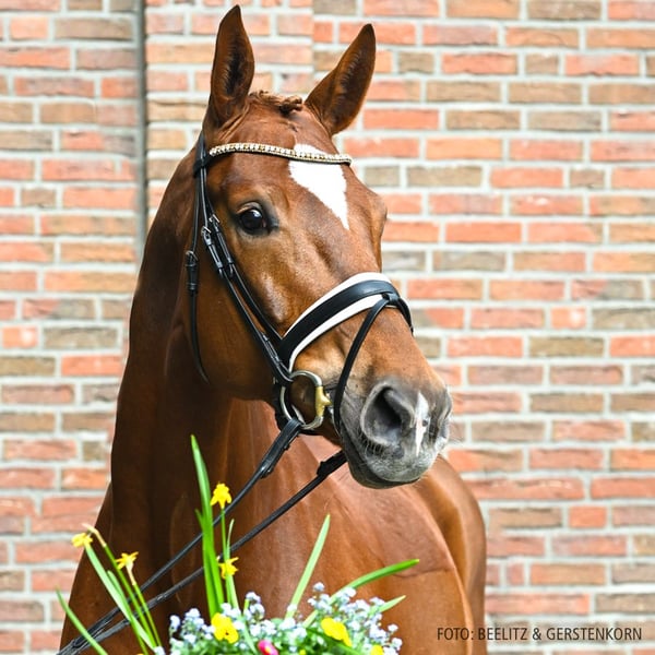 Eine großrahmige und zugleich harmonische Erscheinung ist Dua Lipa. Die achtjährige Fuchsstute qualifizierte sich 2024 für das Bundeschampionat der sechsjährigen Dressurpferde; dies war zugleich ihr bisher letzter Turnierstart. Sie steht seither bei Greta Heemsoth in Beritt und beherrscht die M-Lektionen sicher, der Schritt zur Klasse S ist aktuell noch nicht final vollzogen. Auf den Turnieren präsentierte sich Dua Lipa aufmerksam und unkompliziert und ruft wie auch im täglichen Training ihre gute Grundgangartenveranlagung ab. Mit ihrem Stockmaß von ca. 175 cm kann sie auch die engeren Lektionen durch ihre gute Tragkraft absolvieren; sie wirkt nicht behäbig und passt optisch auch zu zierlichen Reitern. Dua Lipa ist auf ihrem aktuellen M-Level sofort als Lehrmeisterin einsetzbar und verfügt auch im täglichen Umgang über viel Routine und Menschenbezug. Sportname: Dua Lipa 10 Sporterfolge: DPF (Dressurpferdeprüfung) Klasse A (Dpf A): 1/1 Klasse M (Dpf M): 1/2; 2/4 1. Generation Aufbauprüfungen Dressur: Velvet Diamond 3 v. V-Plus (DRE: L). 2. Generation Aufbauprüfungen Dressur: Sie ist schön/Sie ist schön U v. Sir Donnerhall I (DRE: L,VA 2013). Auktionspferde: Fürst Hatton v. Fynch Hatton (VA 2023); Sweet Sunshine v. Sir Donnerhall I (VA 2017); Für Elise/Hot Lady v. Hotline (FoVA 2007). 3. Generation Sportpferde Springen: HannPrA Baccary/BACCARY v. Balou du Rouet (SPR: 1,45 m mit Cyril BOUVARD,VA 2017); Bon Balou 7 v. Balou du Rouet (SPR: 1,40 m mit Ramona Kunze,VA 2012); Belina/BELINA v. Balou du Rouet (SPR: 1,35 m mit Olivier VANDAMME,VA 2017). Aufbauprüfungen Springen: Saphir 344 v. Stakkato (SPR: M mit Jörg Möller); Quaid Lady v. Quaid I (SPR: L,VA 2019). Auktionspferde: HannPrA Balou's Bunte/Balou's Bunte JU v. Balou du Rouet (VA 2015). Bes. Prämientöchter: StPr She's a Lady v. Silvio I. 4. Generation Sportpferde Dressur: Deinhard 13 v. Donnerhall (DRE: S** mit Ellen Fink,VA 1999). 5. Generation Aufbauprüfungen Dressur: gek. Hengst Werther's As/Werthers As v. Werther (DRE: L,Oldenburg 1996,VA 1999). Auktionspferde: Di Chenta 4 v. Del Piero (FoVA 2002); Wie Goldlack/Werthers Amala v. Werther (VA 1997). Mutter: Sunshine Girl ZL: 5/5 ZSP: Feldprüfung Reitpferd - Trab 7,50 Galopp 7,50 Schritt 6,00 / Durchschnitt Rittigkeit 7,75 / Durchschnitt Springen 7,25 Großmutter: Marlene ZL: 12/9 ZSP: Feldprüfung Reitpferd - Trab 7,00 Galopp 8,00 Schritt 8,00 / Durchschnitt Rittigkeit 6,50 / Durchschnitt Springen 5,50