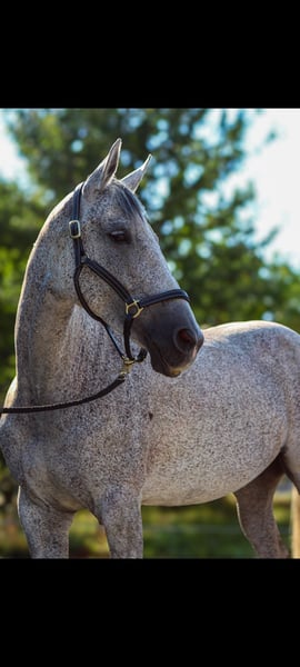 For sale is a 9-year-old mare with excellent jumping lineage – a true diamond in the rough, ready to be refined further. She was backed at the age of four, and at five, she competed in two shows, jumping individual fences up to 1.30 meters at home. She was then purchased by a leisure rider but was not further trained or worked with. She has been in my possession for a year now and is worked with daily. Since summer, she has been under professional riding, with her dressage training further developed; she also shows strong potential and beautiful movement in dressage. She is gradually being reintroduced to jumping calmly. She is very brave over jumps, but due to her training level, she requires a rider with some experience and a steady hand. She certainly has the heart and ambition to perform at the front, as she is not at all spooky or distracted by her environment or other horses, and she thrives on companionship. Additionally, she is incredibly clever. As is typical for a grey, she is very cautious at jumps, has never touched a rail, and is eager to reach the other side. Recent X-rays of her legs and back are available and showed no abnormalities. She has also been tested for all types of PSSM, with negative results. A pre-purchase veterinary examination (AKU) can be arranged at the buyer’s expense. She is currently not shod, accustomed to a box stall with daily turnout and open stable management. A trial ride is of course possible; we kindly ask for a fee of €30 to prevent ride tourism. This amount will be refunded in full upon purchase.