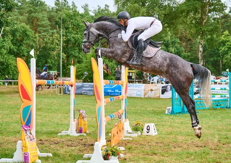 The Hanoverian mare was born in 2017 and has been in our possession since her foal year. Her sire is the powerful show jumper Diacontinus. On her dam’s side, she is out of For Joy (For Pleasure). Both bloodlines provide an excellent foundation for significant potential in show jumping. Her direct half-sister has achieved international placings up to the 1.60m level in Canada throughout her career. During her training over the past years, the mare has been personally introduced by us and has accumulated placings and wins in show jumping competitions from class A up to S-level (1.40m). This Hanoverian is a truly loyal partner in daily handling. With a kind heart, she is straightforward in every situation: from grooming and hoof care to tacking up and bridling, she is an absolute role model. Raised and trained in a family environment, she is familiar with handling children, dogs, and farm machinery. She also enjoys hacking out – alone or on busy roads – and finds it no problem. Quite the opposite! She is also very easy to load and shoe, whether onto a trailer or a horsebox. Her basic gaits are very good, providing a solid foundation for daily dressage work. Due to her perfect size, she is currently ridden alternately by a man and a woman. She is always motivated when riding and in the arena, shows willingness and strength, and possesses the toughness and endurance required for advanced show jumping. With her elegant appearance, the mare is a real eye-catcher and an excellent sport partner with great potential for development. As we own a number of young horses, we are offering her for sale due to lack of time. Radiographic examinations from October 2023 show no findings.