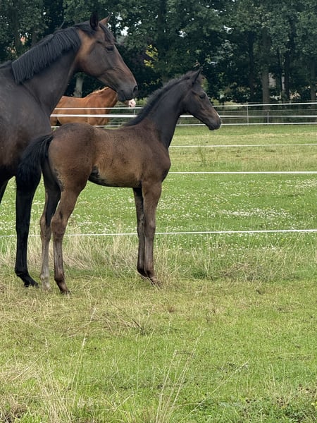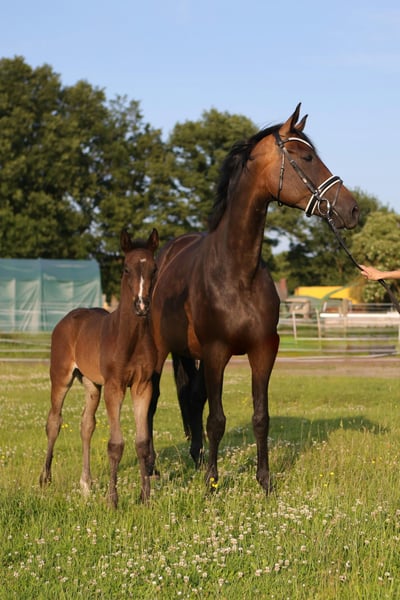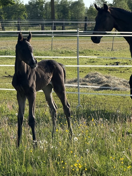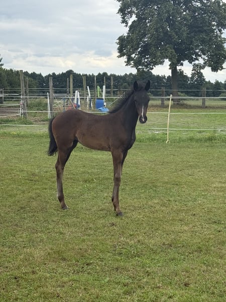 Zum Verkauf steht ein wunderschönes, langbeiniges Stutfohlen mit elegantem Auftreten und edlem Typ. Sie überzeugt durch ihr korrektes Fundament, moderne Linien und eine beeindruckende Ausstrahlung. Dressurbetont gezogen, zeigt sie bereits jetzt sehr korrekte und elastische Grundgangarten: • ein klarer, taktsicherer Schritt , • ein schwungvoller Trab • sowie ein kraftvolle Galoppade. Ihr Wesen ist genauso bezaubernd wie ihre Bewegung – sie ist menschenbezogen, neugierig und liebenswert im täglichen Umgang. Das Fohlen-ABC (führen, putzen, Hufe geben) beherrscht sie souverän und zuverlässig. Ein ganz außergewöhnliches Nachwuchstalent für ambitionierte Dressurreiter und Züchter, das gleichermaßen durch Qualität wie auch durch Charakter überzeugt.