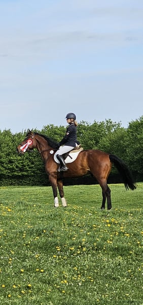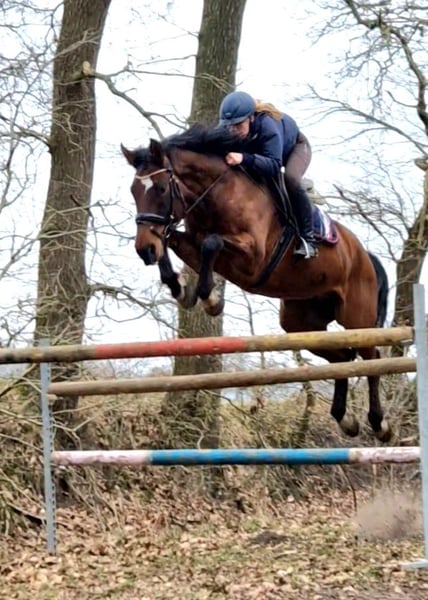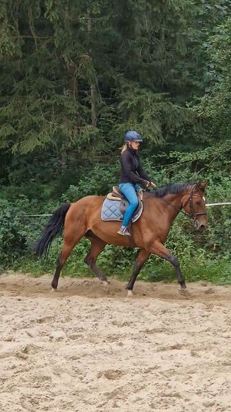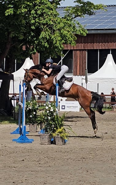 Strotmann is a 10-year-old Hanoverian gelding. He gives you a great feeling, whether in daily dressage work, during gymnastic exercises, or in show jumping. We bought Strotmann as a "replacement horse" for my daughter, as we wanted/needed to sell her previous competition horse. Since things have turned out differently now, we have to part with him with a heavy heart. He has already won several L classes up to 1.15m and is multiple placed in M*. He always fights for his rider. He can also jump without any problems without a saddle. He is very affectionate and has a playful character.