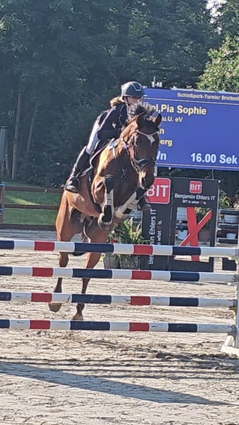 Herbstchance, da wir zum Winter reduzieren müssen. Bis M* Springen (2. mit über 50 Teilnehmern mit Jugendlicher ) teilweise mit Höchstnoten (bis 8,7 mit Fremdreiterin, Juniorin) platzierter Wallach mit richtug Vermögen und Vorsicht ausgestattet. Überrascht hat er uns im Vielseitigkeitstraining: er springt auf Anhieb alles, was man ihm zeigt. Bis Klasse L (incl schräger Hecken und Kuhkopf ohne Begrenzung, Schmalsprünge, Gräben, Auf und Absprünge- wir glauben hier steckt richtig Talent drin. Er gibt einem ein super Gefühl, ob in der täglichen Dressurarbeit, bei Gymnastikreihen oder beim Parcoursspringen. Er kämpft für seinen Reiter. Auch ohne Sattel lässt er sich ohne Probleme springen. Er ist total verschmust und hat einen verspielten Charakter. Sichere Wechsel, grundschnell, barhuf. Wurde bei uns auch schon von 10 jähr Mädchen geritten und gesprungen. Geht alleine und mit mehreren ins Gelände.