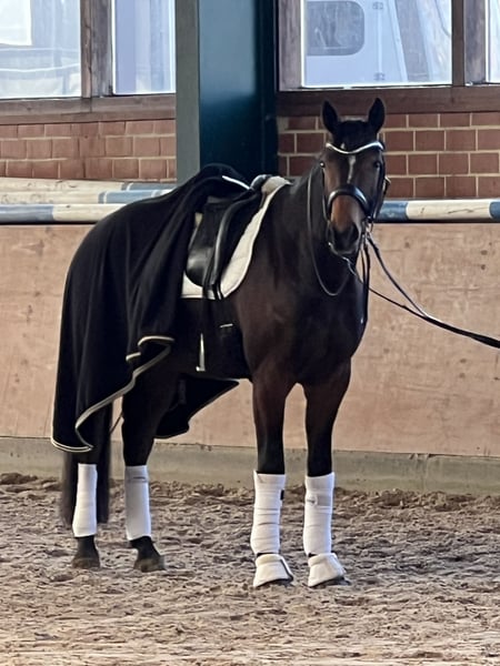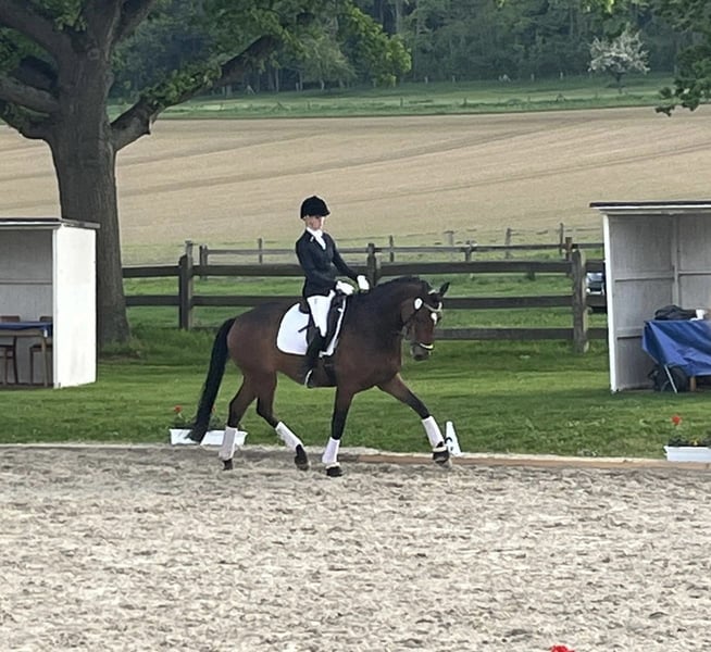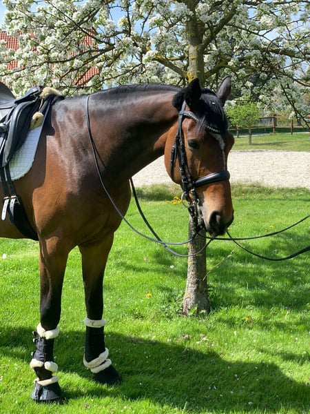 For sale is this super brave 9-year-old gelding by Lissaro van de Helle x Don Crusador. This bay gelding impresses with three very good, energetic basic gaits that are also great to sit. He confidently masters the exercises of class M** and is on his way to class S, jumping series changes up to three jumps with ease, always jumping uphill, and can also perform canter traverses without any issues. With his affectionate and cuddly nature, he is the perfect partner for both sport and leisure. He is farrier-friendly and loading-friendly, and he is accustomed to daily turnout in the pasture/paddock and is very sociable. Videos available upon request for serious inquiries. Please direct all inquiries by phone only. The price is in the upper price segment. Trial rides available for a fee of €35 to avoid riding tourism (the fee will, of course, be deducted from the purchase price).