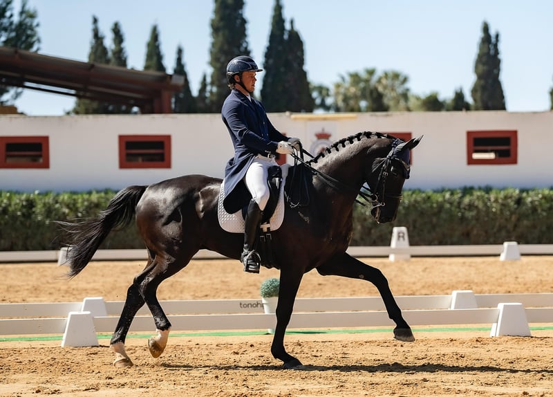 On behalf of a customer: This exceptional horse is for sale! He is the son of Desperados FRH, who died in 2020 and was the undisputed number 1 of all dressage horses worldwide in 2016 and was named "Hanoverian Stallion of the Year". The 8-year-old gelding is currently ridden + placed at PSG and has already mastered the piaffe, passage, pirouette and is jumping his first single changes. A horse with incredible potential for the big arena. More information and videos only on serious request! Large purchase examination incl. x-rays available. Impressive black gelding offered for sale, ideal for high-level dressage. He boasts top-quality bloodlines and a commanding presence. Standing at 1.76 m with a strong, athletic build, he is approaching 9 years old and has an exceptional training and competition background. Key Features: • Elite Pedigree: Bred from some of the best dressage bloodlines available. • Presence and Elegance: Striking black coat and natural charisma that turns heads wherever he goes. • Outstanding Movement: Naturally expressive gaits, consistently scoring up to 8 in competitions judged by top-level professionals. • Training Level: Confirmed at Intermediare I and currently working on Grand Prix movements, which have already been shown but not yet confirmed. • Intelligent and Quick Learner: Very smart horse with excellent trainability and work ethic. • Temperament: Gets along well with other horses, no vices or bad habits. Used to groundwork and enjoys hacking out. • Health: Completely sound and in peak condition. Competition History: • Competed in several national and international events, including a Spanish National Championship. • Selected for the Spanish National Team. • Multiple-time regional champion. Recommended for: Advanced rider looking for a high-level competition partner with proven talent and potential. Location: Spain - transport can be organized worldwide