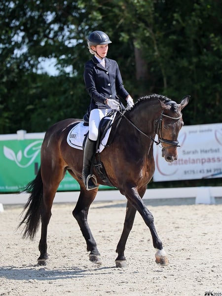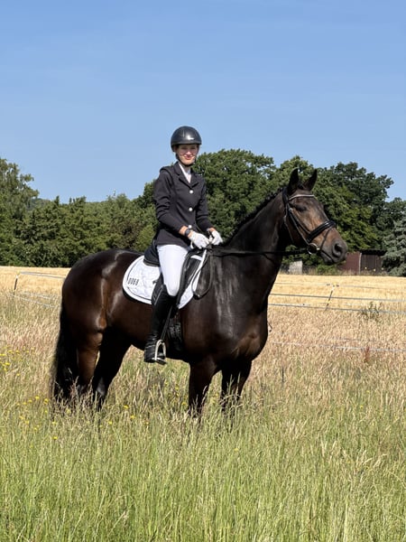 Verkaufe tollen Allrounder und absolutes Herzenspferd! Schweren Herzens muss ich mich aus zeitlichen und familiären Gründen von meinem Herzenspferd trennen. Finnlay ist ein großer, kompakter dunkelbrauner Wallach, der vor allem durch seinen unkomplizierten und liebevollen Charakter besticht. Er liebt den Menschen, möchte stets gefallen und alles richtig machen. Dabei ist er völlig unerschrocken, ausgeglichen und eine absolute Lebensversicherung auf dem Reitplatz und im Gelände. Er kennt landwirtschaftliche Fahrzeuge, Straße, Hunde, Katzen und Schafe. Er lässt sich alleine verladen und fahren, ist unkompliziert mit Tierarzt und Schmied. In der Herde ist er sehr entspannt und passt sich den Gegebenheiten an. Durch seine sehr gute dressurmäßige Ausbildung (platziert in Klasse L, im Training auch M-Lektionen) ist er sehr einfach zu bedienen, ohne dabei elektrisch oder zu sensibel zu sein. Dadurch verzeiht auch so manchen Reiterfehler. Er springt gut und gerne (platziert bis Klasse A) und verweigert nie. Auch im Parcours möchte er stets alles richtig machen. In den letzten zwei Jahren wurde er sehr vielseitig geritten und war in seiner ersten Vielseitigkeitsprüfung im letzten Jahr auch gleich platziert. Er kennt Gelände, Wasser, Gräben und Wälle. Finnlay ist ein Pferd, was jeden Tag Freude bereitet! Er benötigt aufgrund seiner weichen Hufsubstanz vier Eisen, ca. alle 6 Wochen den Schmied und sollte überwiegend trocken stehen. Aktuell steht er tagsüber auf der Weide und nachts in einer trockenen Spänebox. Nach einer Op am Kehlkopf vor 5 Jahren (Nerventransplantation, keine Prothese!) wiehert er heiser und hat je nach Tagesform einen leichten Ton, der im Laufe der Arbeit meistens verschwindet. Er ist dadurch in seiner Leistung und täglichen Arbeit völlig unbeeinträchtigt. Ich habe Finnlay seit 8 Jahren, kenne seine Züchterin und Ausbilderin und weiß, dass dieses Pferd noch nie schlechte Erfahrungen gemacht hat. Bis auf die Kehlkopf-Operation war er nie ernsthaft krank oder lahm. Ich wünsche mir für Finnlay ein liebevolles neues Zuhause, wo er als Partner und Freund geschätzt wird, so wie es dieses tolle Pferd verdient. Er ist voll im Training und wäre sicher in der anstehenden Saison ein guter Lehrmeister für einen noch unerfahrenen Reiter in den unteren Klassen. Ich würde mir aber wünschen, dass der Freizeitspaß mit ihm im Vordergrund steht. Bei Bedarf kann sein perfekt angepasstes Sattelzeug gerne übernommen werden. Platz vor Preis!!! Bei ernsthaftem Interesse meldet euch gerne telefonisch oder über WhatsApp.