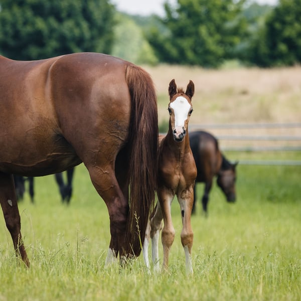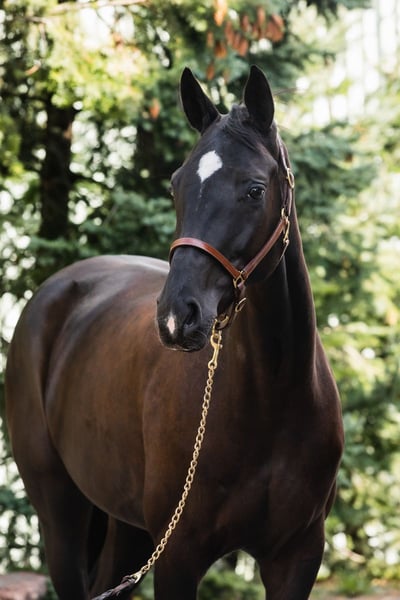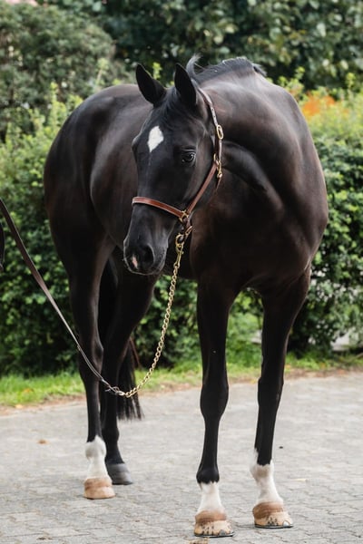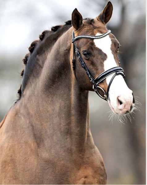 Bugatti est un poulain issu d’une remarquable lignée de dressage Hanoverienne. Bai avec de magnifiques marques blanches : trois chaussettes très hautes et un masque blanc, il est spectaculaire à chaque mouvement. Extrêmement bien construit, avec de belles proportions et des membres postérieurs actifs, il laisse déjà présager qu’il deviendra un compagnon de sport exceptionnel. Le père de Bugatti, Benicio, est un excellent exemple de ce à quoi doit ressembler un étalon Hanoverien. Lors de ses 30 jours d’évaluation à Schlieckau, il a obtenu la note maximale de 10,0 à dix reprises. Sa note finale pondérée de 9,14 lui a assuré une victoire claire. Sa valeur de reproduction HLP pour le dressage s’élevait à 167. La mère de Bugatti est une jument noire, moderne et d’un style extrêmement élégant, issue de la race Westphallienne, nommée Finschen.
