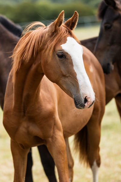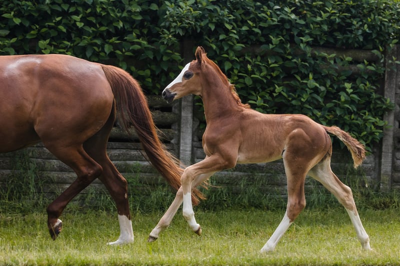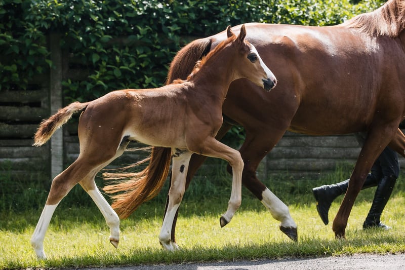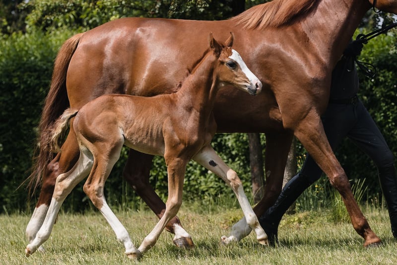 Bugatti ist ein Hengstfohlen aus einer wunderbaren Hannoveraner Dressurlinie. Er ist fuchsfarben und hat wunderschöne weiße Abzeichen: drei sehr hohe Socken und ein kahles Gesicht, er sieht spektakulär aus, wann immer er sich bewegt. Extrem gut gebaut mit tollen Proportionen und aktiven Hinterbeinen, sehen wir bereits, dass er ein erstaunlicher Sportbegleiter werden wird. Bugattis Vater Benicio ist ein gutes Beispiel dafür, wie ein Hannoveraner Hengst aussehen sollte. Bei seinem 30-Tage-Test in Schlieckau erhielt er insgesamt zehnmal die Höchstnote 10,0. Die gewichtete Endnote von 9,14 bedeutete einen klaren Sieg. Sein HLP-Zuchtwert für die Dressur lag bei 167. Bugattis Mutter ist eine schwarze, moderne, äußerst stilvolle westfälische Stute namens Finschen.