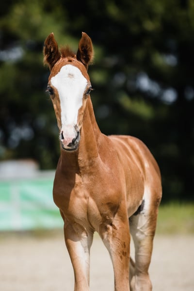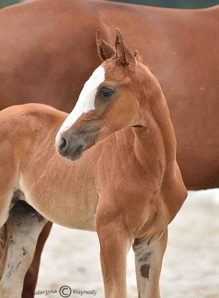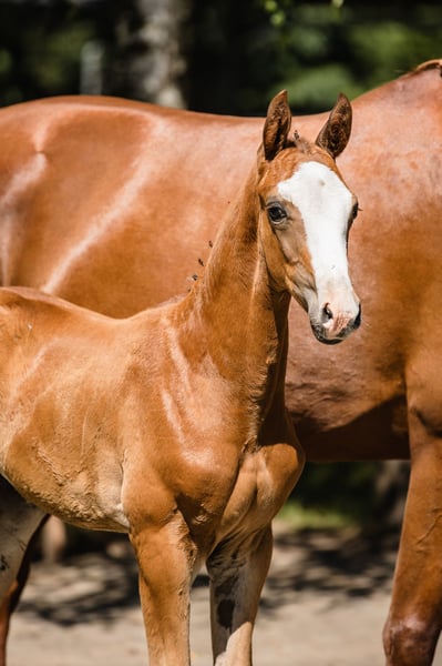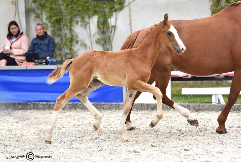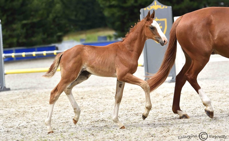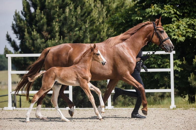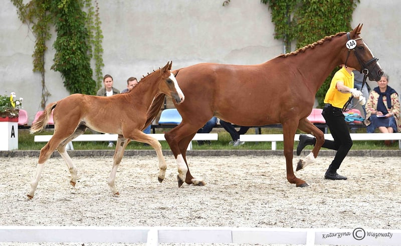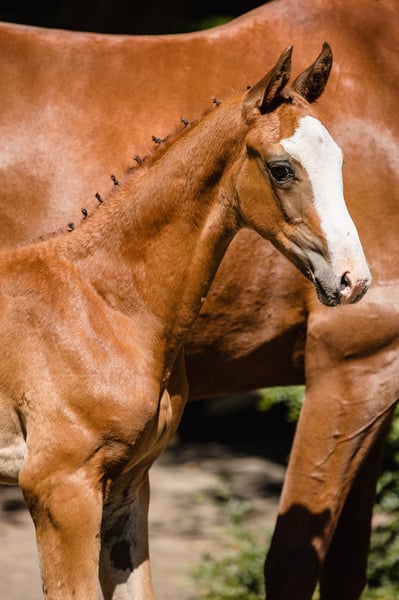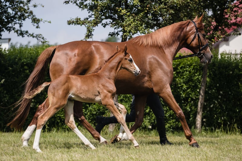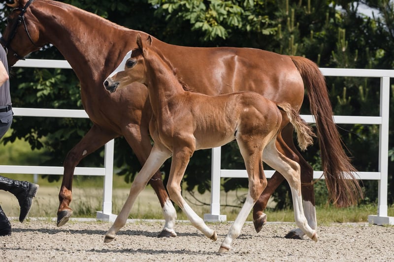 Bugatti is a colt from an amazing dressage Hanoverian line. Chestnut and with beautiful white marks: three very high socks and bald face, he looks spectacular whenever he moves. Extremely well-built with great proportions and active hind legs, we already see that he will become an amazing sport companion. Bugatti’s father, Benicio, is a great example of how a Hanoverian stallion should look like. In his 30-day test in Schlieckau, he received the maximum score of 10.0 a total of ten times. The weighted final score of 9.14 meant a clear victory. His HLP breeding value for dressage amounted to 167. Bugatti’s mother is a black, modern, extremely stylish Westphallian mare named Finschen.