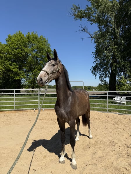 Priced well below market value! Tell me about his future home, and we will surely come to an agreement. Currently approximately 16.1 hh, still growing with age. Born April 2023. Expected to mature over 17 hh. He may turn gray later and has four white markings, giving him a particularly noble and striking appearance. In terms of character, he is mostly calm, very people-oriented, and cuddly. He is pleasant and uncomplicated in daily handling. He gets along very well with other horses, whether mare or gelding, and is familiar with loading, which has always gone smoothly, as well as walks outside. Environmental stimuli such as tractors, cars, and other traffic do not bother him. Farrier and veterinarian visits are generally no problem. The gelding is lunged and shows himself attentive and eager to learn. The first time with saddle and bridle did not bother him at all. This young horse has a lot of potential. Not suitable for beginners, as he still needs to be backed. Location: District of Stade