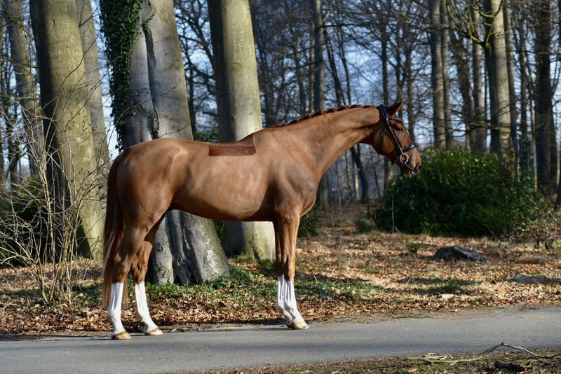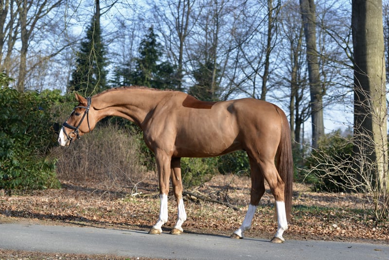 Kleurrijke donkerbruine voshengst van de kampioenhengst Bonds