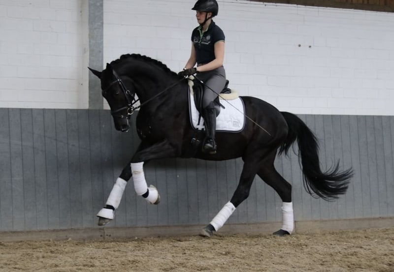 Un imponente castrone hannoveriano nato nel 2020, questo bellissimo cavallo nero colpisce per il suo aspetto elegante e per la sua sorprendente meccanica anteriore. Un diamante grezzo che dovrebbe essere lucidato con sensibilità. Mostra un grande potenziale nel dressage ed è già stato addestrato con delicatezza. Con il suo carattere amichevole e la sua disponibilità al lavoro, è adatto sia a dilettanti ambiziosi che a professionisti. Se siete interessati e desiderate ulteriori informazioni, non esitate a contattarci.