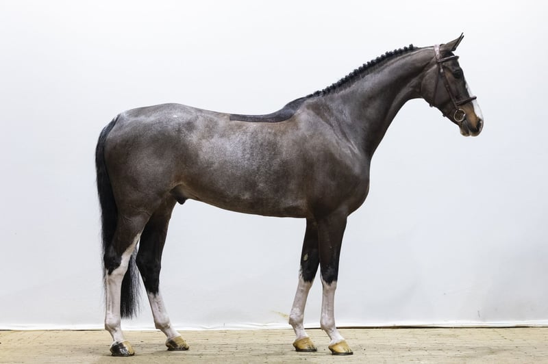 An eye-catching horse in both type and markings. A real standout in the ring. Beautifully uphill built with a sporty presence. He already has 1.20m experience and clearly shows his quality and mindset. He has a good, ground-covering canter and wants to be careful over the fences. Light-footed in his way of jumping with a pleasing technique. A horse that attracts attention through both his appearance and his way of moving.