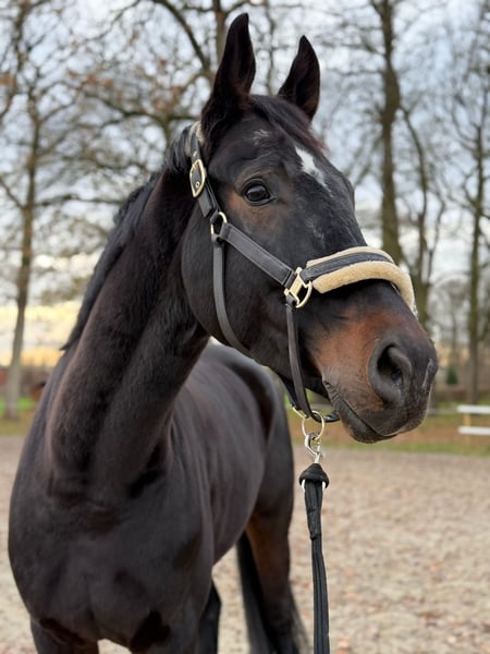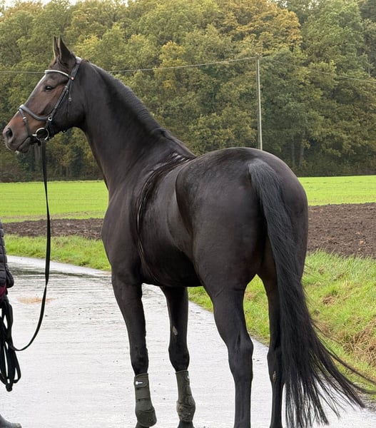 Zazu, a 7-year-old Hanoverian gelding by San Amour × Don Frederico, is a striking presence that is rare to see. Standing approximately 180 cm at the withers, he not only commands attention with his impressive stature but also possesses a strong personality. He is well-schooled and consistently behaves well under saddle. However, he is still at the beginning of his training and not yet fully advanced in his riding development, which means he requires an experienced rider to continue his education with consistency and dedication – as he definitely has potential for more. That said, Zazu is not suitable for everyone: the gelding is confident and knows exactly who is in charge on the other end of the lead rope. In handling and under saddle, he seeks a person who can provide natural authority, composure, and clear, loving guidance. Due to his size, he is also well-suited for large adults. He is a horse that needs a task and appreciates someone who offers him security through consistency and routine. Because of his strong character, he is explicitly not a children's or beginner's horse. We are looking for experienced or advanced horsepeople who understand and appreciate such a horse, and who have the calmness and assertiveness needed to develop him into the top partner he can become. In daily routines, he also behaves well. He is both farrier- and loading-friendly (currently shod in front, which should be maintained for now, as he tends to short feet) and handles well once the hierarchy is clear. Anyone seeking a large, intelligent sport horse with a strong personality and great potential will find a lifelong partner here—one who will go through fire for his owner once trust is established. The price is negotiable within a realistic range. Additional photos and videos can be sent upon request, and a meeting or trial ride is also possible. Best contact by phone or WhatsApp.