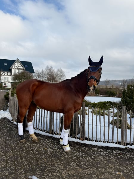 For sale is this exceptionally well-behaved, balanced, and high-quality 8-year-old Don Index gelding, who has already competed successfully up to class L at shows. At four years old, he achieved top scores of 8 in riding horse tests, highlighting his excellent basic qualities. Since then, he has earned several successes with an amateur rider up to class L* and is now ready to build on these achievements in the upcoming season in classes L** and M*. Not only is he a reliable partner in the arena, but he also excels in the outdoor riding area. He remains completely focused and fearless in all situations, making him the perfect horse for children, beginners, re-entrants, or even ambitious sport riders. Besides his lovable character, he possesses the quality needed for competitive riding. "Felix" is a truly lovable horse who always aims to please his rider and brings great joy to daily training! Of course, "Felix" has a valid veterinary certificate, is shoeing and loading friendly. He gets along very well with other horses. He can be viewed and tested at any time in 35708. For further questions and interest, please contact: 017620052380, WhatsApp available as well.