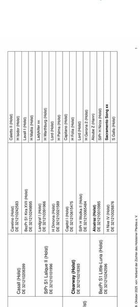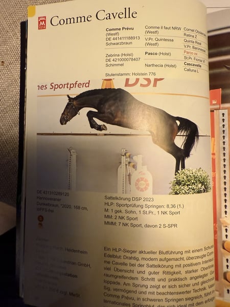 Un puledra di razza, nata il 30.03.2025, da una fattrice premiata di razza Holsteiner, che ha partecipato a competizioni di salto ostacoli di categoria A e L. Il padre è il giovane stallone Comme Cavelle (da Comme Prevu). Ha vinto il PSA Tour a Donaueschingen nel 2024 con un punteggio di 9,0 sotto la guida di Richard Vogel.