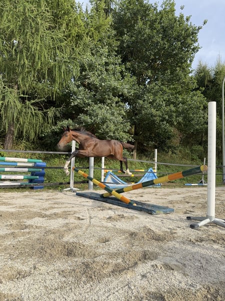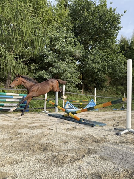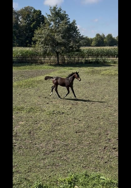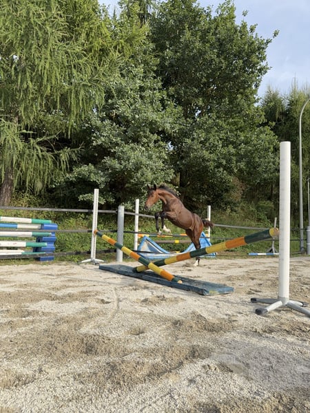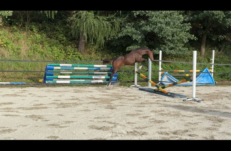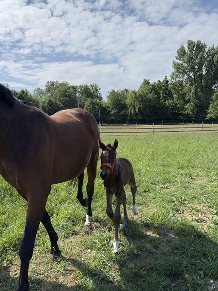 Madame Mona Lisa (*14/05/2025) è una puledra marettina Holstein, dal mantello scuro e molto presenza. Si presenta sicura di sé, curiosa ed energica – un piccolo concentrato di forza con la testa lucida. Fin da piccola, ha esplorato autonomamente i barriere e i cavaletti, saltandoli di propria iniziativa, indipendentemente dalla madre. Durante un salto libero e giocoso, ci ha impressionato per la sua visione d’insieme, il coraggio, oltre a un atterraggio pulito e una tecnica corretta. In lei si uniscono il fuoco francese con la tipica volontà e resistenza di un Holstein: Padre: Adzaro de L’Abbaye B (classificato a 1,50 m; vincitore della selezione) Nonno materno: Presley Boy (classificato a 1,60 m – tra cui GLCT) Anche il sangue di altri importanti stalloni come Quidam de Revel, Diamant de Semilly e Furioso xx scorre nelle sue vene paterne, così come Voltaire, Contender, Ladykiller e Ramiro Z da parte materna. La sua sorellastra si è già distinta al suo secondo torneo, conquistando il quarto posto con un punteggio di 7,4 in una prova di salto a ostacoli di classe A*! Mona Lisa cresce senza pressioni, in un ambiente tranquillo, in un gruppo misto di cavalli giovani e anziani (puledri – pensionati), ed è abituata al “mondo del puledro”: dalla guida, al legare, alla pulizia e alla cura degli zoccoli, tutto fa parte della sua routine quotidiana. Attualmente stiamo anche lavorando sul carico e sul trasporto in trailer. Naturalmente, viene regolarmente sverminata e si comporta come una professionista! Finora, non è stato necessario intervenire sui suoi zoccoli con il ferratore, e anche la raspatura minima con una lima per zoccoli è naturale per lei. Nel suo approccio quotidiano, è molto sensibile e facile da gestire – con bambini e altri animali (gatti e cani) si mostra sempre prudente e attenta. Madame Mona Lisa non solo possiede un potenziale promettente per il salto ostacoli o per la futura riproduzione, ma vediamo anche in lei delle possibilità nelle categorie Hunter e nel concorso completo. Per domande o interessamenti, non esitate a contattare (preferibilmente via WhatsApp): Michaela Jahrstorfer +49 175 1192376 Si prega di notare che la nostra descrizione di Madame Mona Lisa non garantisce caratteristiche specifiche, ma rappresenta una valutazione soggettiva basata sul nostro lavoro quotidiano con lei.