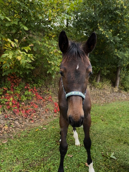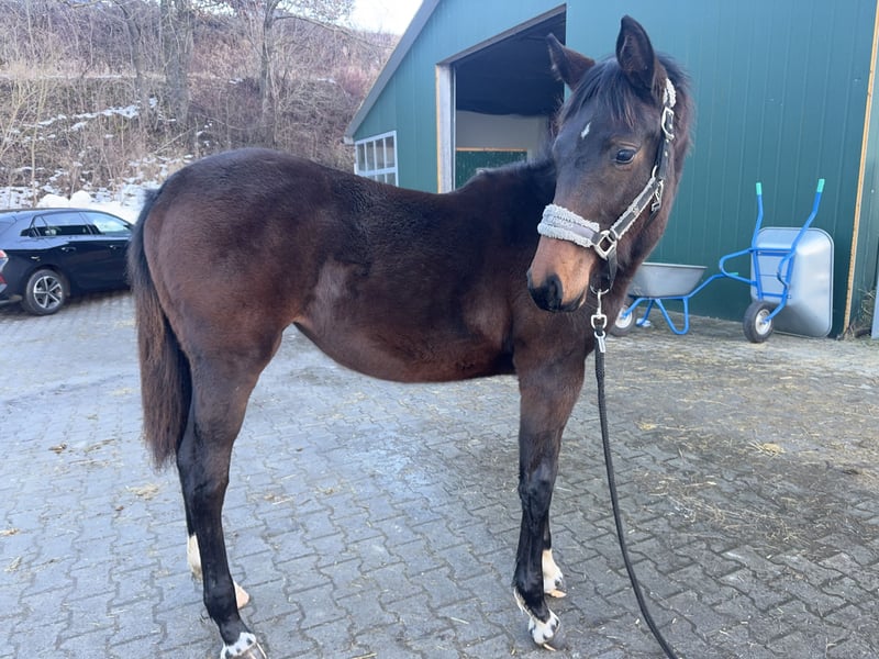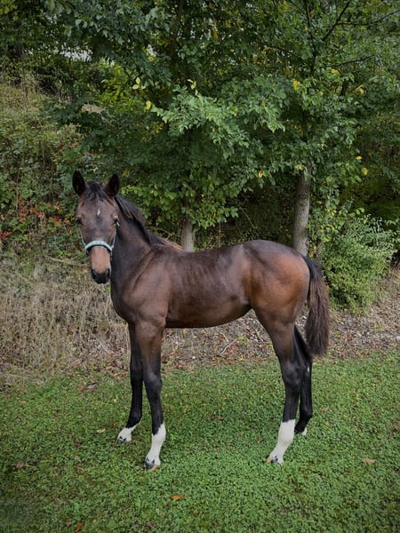 Madame Mona Lisa (*14.05.2025) ist ein ausdrucksstarkes Holsteiner Stutfohlen, in dunkler Jacke mit viel Präsenz. Sie zeigt sich selbstbewusst, neugierig und voller Energie - ein kleines Kraftpaket mit klarem Kopf. Schon früh erkundete sie unabhängig von ihrer Mutter Stangen und Cavalettis und sprang diese aus eigenem Antrieb. Bei einem ungezwungenen spielerischen Freispringen, beeindruckte sie uns durch Übersicht, Mut, sowie einem sauberem Absprung und korrekter Technik. In ihr vereint sich das französische Feuer mit der typischen Willensstärke und Beständigkeit eines Holsteiners: Vater: Adzaro de L´Abbaye B (1.50 platziert; Körungssieger) Muttervater: Presley Boy (1.60 platziert - u.a. GLCT) Ebenfalls fließt durch Mona Lisa´s Adern das Blut weiterer bedeutender Vererber wie Quidam de Revel, Diamant de Semilly und Furioso xx über ihre väterliche Seite und ebenso Voltaire, Contender, Ladykiller und Ramiro Z mütterlicherseits. Ihre Halbschwester konnte sich bereits auf ihrem zweiten Turnier mit einer 7,4 in einer Springpferdeprüfung der Klasse A* den 4. Platz sichern! Mona Lisa wächst bei uns ohne Druck und mit Ruhe in einer altersgemischten Herde auf (Fohlen - Rentner) und kennt das Fohlen-ABC - vom Führen über das Anbinden und Putzen bis hin zum Hufe auskratzen etc. gehört für sie sowas zur täglichen Routine. Aktuell erarbeiten wir auch das Verladen und Hänger fahren. Selbstverständlich wird sie regelmäßig entwurmt was sie wie ein Profi mitmacht! Bisher war noch keine Bearbeitung ihrer Hufe durch den Schmied notwendig und minimale Bearbeitung wie das Abraspeln mit einer Hufraspel nimmt sie ebenfalls selbstverständlich an! Im täglichen Umgang ist sie sehr fein und unkompliziert - gegenüber Kindern und anderen Tieren(Katzen und Hunden) ist sie durchwegs vorsichtig und umsichtig! Madame Mona Lisa bringt nicht nur vielversprechendes Vermögen für den (Spring-)Sport oder die spätere Zucht mit, wir sehen auch in Hunter-Klassen und der Vielseitigkeit eine Perspektive für sie. Bei Fragen oder Interesse melden Sie sich gerne (am besten per WhatsApp Nachricht) bei: Michaela Jahrstorfer +49 175 1192376 Bitte beachten Sie, dass unsere Beschreibung von Madame Mona Lisa keine zugesicherten Eigenschaften sind, sondern lediglich eine subjektive Einschätzung unsererseits auf Grundlage der täglichen Arbeit mit ihr.