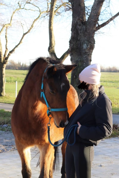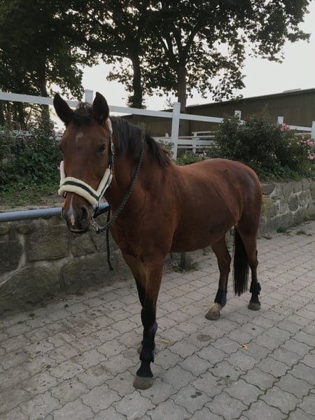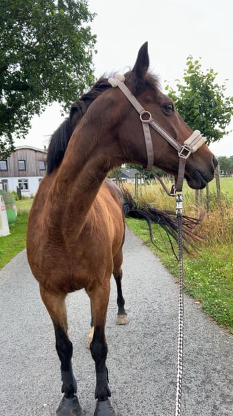 Holsteiner Mare with passport, born in 2004, 1.65 m tall, regularly vaccinated and dewormed. Kaya has been with me since 2012, and I am only selling her now because I am moving to the capital for personal and professional reasons and cannot take her with me or give her the attention she deserves. Therefore, I am truly parting with her only with a heavy heart, and it is very important to me that she finds a responsible and caring new home — priority over price! Despite being 21 years old, she is fully rideable and in excellent condition, aside from mild Cushing’s disease, which mainly manifests as a slightly thicker coat in winter than typical for a Holsteiner. Thanks to Prascend, we have managed this well so far. She is very well-behaved, knows groundwork, and works attentively and with enthusiasm. She also enjoys jumping, preferably with an experienced rider. She likes to go out on rides and appreciates mental stimulation. She is good with the farrier and veterinarian, though she’s not particularly fond of trailer transport since she hasn’t had to do it often, but she handles it well. She is also familiar with dogs and cats. In terms of character, she is very friendly, curious, and open-minded. She also gets along well with children. For the past ten years, she has been housed in a paddock paradise with a mixed herd, where she has always been calm and balanced. Feel free to contact me anytime if you have further questions!