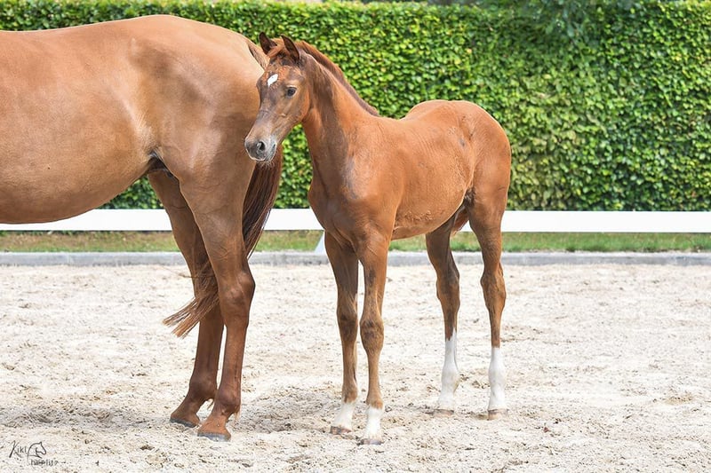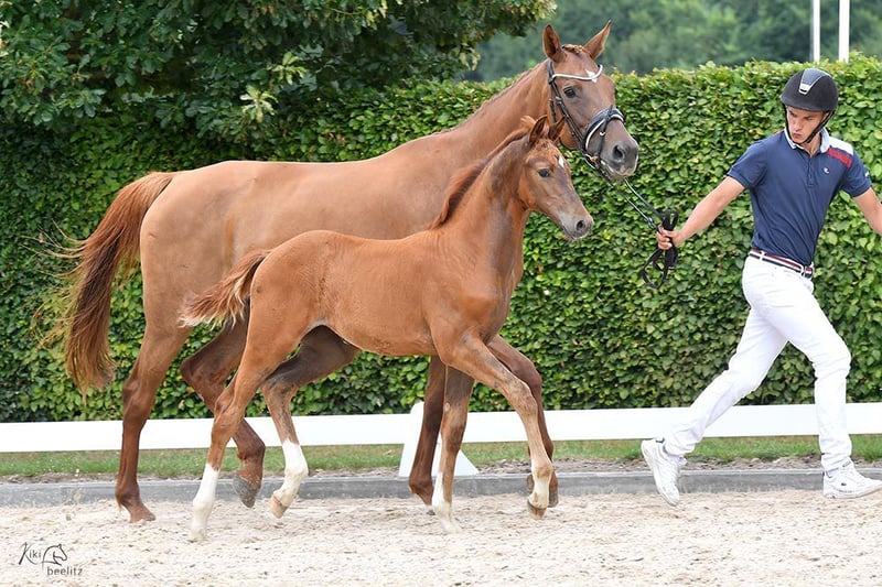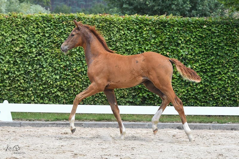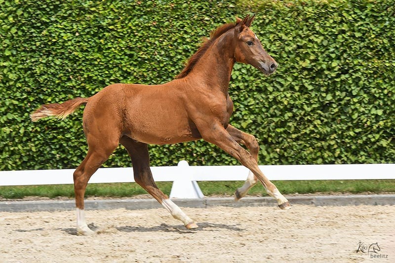 Het merrieveulen is super gefokt via Kjento-Vivaldi en is een absolute zeldzaamheid als Holsteiner dressuurpaard. De merrie komt uit de gerenommeerde Holsteiner merrielijn 474a, een lijn die vele internationaal succesvolle springpaarden heeft voortgebracht. De merrie zelf is een extreem type, hoogbenige verschijning met veel inhoud. Ze is echt een absolute blikvanger. Haar innerlijk is al even opmerkelijk - ze is heel aardig, benaderbaar, ontspannen en tegelijkertijd zelfverzekerd. Altijd aanwezig, ze laat zich altijd van haar beste kant zien. Ze is een heel braaf veulen dat opvalt door haar uitzonderlijke type. Het is vooral het vermelden waard dat ze uitstekende cijfers kreeg bij de veulenregistratie en zich kwalificeerde voor de veulenkampioenschappen. Om zich te kwalificeren moest ze een gemiddelde score van meer dan 8,0 halen, wat ze deed. Ze behaalde de derde plaats. Dit laat zien hoeveel potentie ze heeft. Ze zal waarschijnlijk ook een groot paard worden, want haar moeder is ongeveer 1,70 meter lang. Neem contact op: we laten je dit uitzonderlijk goede veulen graag ter plekke zien. Uit ervaren, duurzame topfokkerij met veel ruimte en weidegang, dus met de beste omstandigheden voor een lange, gezonde levensduur. Optimaal verzorgd, voorzien van mineralen, kerngezond, regelmatig ontwormd en regelmatig naar de hoefsmid. De vader van dit veulen is de tweevoudig wereldkampioen jonge dressuurpaarden, Kjento, die zowel bij de 6- als de 7-jarigen wereldkampioen werd! Zijn basisgangen zijn van uitstekende kwaliteit, waarbij vooral zijn krachtige draf opvalt (score 10,0). Kjento maakt ook indruk met zijn opmerkelijke rijdbaarheid en bereidheid om te werken. Door hem met deze hengst te fokken, verwachten we dat zijn uitzonderlijke talent en hoge prestatiebereidheid doorgegeven zullen worden aan dit jonge paard.