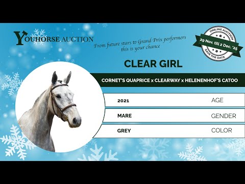De vierjarige Clear Girl springt met een opvallend goede techniek en veel afdruk. Ze springt thuis een klein parcours en is klaar om mee te gaan op wedstrijd. Vader Cornet’s Quaprice (1.40m springen) is het resultaat van de combinatie Cornet Obolensky x Quaprice Bois Margot en komt uit de lijn van Cutting Edge (1.50m springen met Cian O’Connor). Moeder K-Juna is een dochter van de 1.55m hengst Clearway en de 1.45m merrie Fiona (v.Helenenhof’s Catoo).