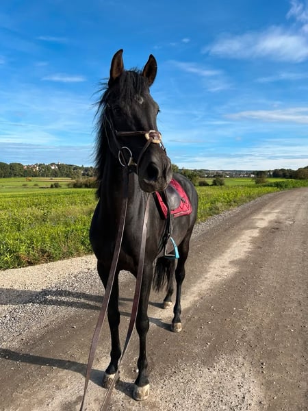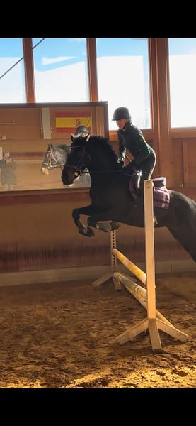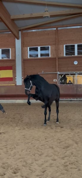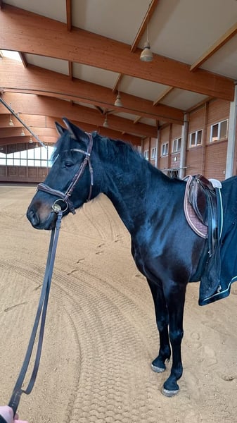 With a heavy heart, I am seeking a new home for my 2020-born Spanish x Holsteiner mare (Uno I), standing approximately 1.63 meters at the withers. Montana comes from our own breeding and has been raised and handled with care. Her mother, a Spanish mare with a high Carthusian influence, is available for viewing on-site. Her sire is the Holsteiner stallion Uno 1, descending from Uriko - Colman, based in Marbach. This makes her also an interesting prospect for breeding. I am selling Montana because I want to pursue higher-level competition, which I cannot dedicate enough time to with her. She is a horse that seeks to be challenged and developed. She enjoys working and especially has great fun in liberty work. In a short time, she has learned Spanish walk, shoulder-in, lateral movements, circles, lying down, and mounting (all also free) on command. She is also an excellent partner in the field, promising wonderful riding hours, whether in a group or alone. I prefer to find experienced leisure riders who enjoy riding out and working with her on the ground or in liberty. She has great potential and motivation in this area, and I hope she will be further encouraged here. Montana is easy to gymnasticize and offers very comfortable gaits. In the arena, she always responds lightly to aids but is by no means overly sensitive. She also enjoys small jumps. Due to muscular sensitivity in her hip, she is not suitable for competitive sport. After excessive or intense training, especially jumping, she may show slight irregularity in her gait—however, as a leisure horse (confirmed by a veterinarian), she shows no signs of this under normal riding conditions. She had a longer break from riding in the middle of last year. For the past three months, she has been ridden again for leisure and is doing very well. Additionally, I am happy to stay in contact with the new owner after the sale and receive occasional updates. Montana has been my little girl’s dream since birth and is very dear to me. If you feel addressed by this, please don’t hesitate to contact me! WhatsApp: 01702924716 Best contact by phone: 01709343872 Accessories can be purchased at an additional cost.