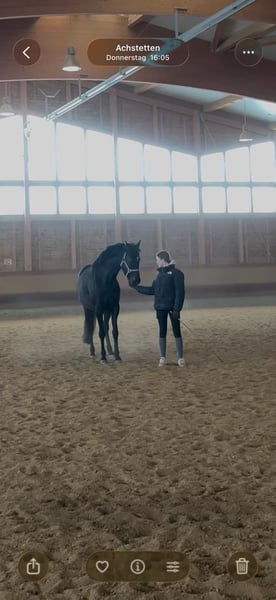 Schweren Herzens suche ich für meine 2020 geborene Spanier x Holsteiner ( Uno I ) Stute, mit einem Stockmaß von ca. 1.63m, einen neuen Platz. Montana ist aus unserer Zucht und behütet aufgewachsen sowie geritten worden. Ihre Mutter (Spanier mit hohem Kartheuseranteil) ist vor Ort und kann besichtigt werden. Ihr Vater ist der Uriko - Colman abstammende Holsteinerhengst Uno 1 aus Marbach. Dadurch wäre sie auch für die Zucht interessant. Verkauft wird Montana da ich in den höheren Sport einsteigen möchte, wodurch ich ihr zeitlich nicht gerecht werde. Sie ist ein Pferd welches gefallen und gefördert werden möchte. Sie arbeitet gerne mit und hat vor allem an der Freiarbeit großen Spaß. In kürzester Zeit hat sie so Spanischen Schritt, Schulterherein, Seitengänge, Zirkeln, Liegen und Steigen (alles auch Frei) auf Kommando gelernt. Auch im Gelände ist sie ein super Partner und garantiert tolle Stunden im Sattel. In der Gruppe sowie allein. Ich suche am liebsten erfahrene Freizeitreiter die gerne ins Gelände gehen und am Boden / Frei mit ihr Arbeiten. Gerade hier hat sie großes Potenzial und Motivation, bei der ich mir wünsche, dass sie hier gefördert wird. Montana ist leicht zu gymnastizieren und bietet sehr bequeme GGA. In der Bahn zeigt sie sich immer leicht an den Hilfen, jedoch auf keinen Fall übersensibel. Auch an kleinen Sprüngen hat sie Freude. Sie ist jedoch aufgrund einer muskulären Sensibilität an der Hüfte nicht für den Sport geeignet. Nach übermäßigem / starkem (vor allem Spring- ) Training zeigt sie einen leichten Untakt. - Als Freizeitpferd (durch Tierarzt bestätigt) jedoch ohne Probleme ohne Anzeichen. Sie hatte Mitte des letzten Jahres eine längere Reitpause. Seit ca. 3 Monaten wird sie wieder freizeitmäßig geritten und zeigt sich super. Zusätzlich freue ich mich, nach dem Verkauf Kontakt zum neuen Besitzer zu halten und mal ab und an Updates zu bekommen. Sie ist seit ihrer Geburt mein kleiner Mädchentraum und liegt mir sehr am Herzen. Falls du dich hier angesprochen fühlst, melde dich gerne bei mir! WhatsApp: 01702924716 Telefonisch am Besten direkt unter 01709343872 Zubehör kann gegen Aufpreis mit erworben werden.