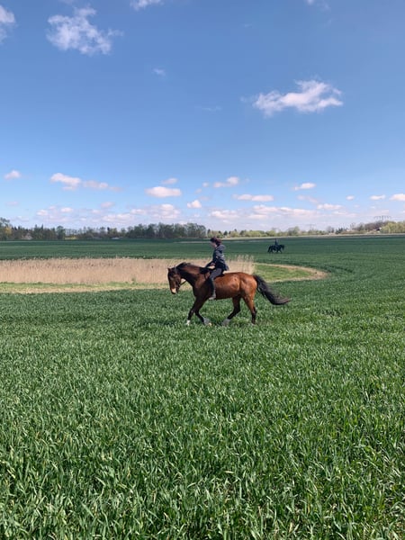 Schweren Herzens verkaufe ich hier, rein aus Zeitgründen, meinen lieben Wallach Gigolo. Er ist ein unheimlich liebes und talentiertes Pferdchen, dass mittlerweile 3 Reitweisen beherrscht (Englisch, Barock, Western - Englisch ist unsere Hauptreitweise), jederzeit souverän und cool bleibt und sowohl ein- als auch beidhändig geritten werden kann. Gigo kennt gebisslose und "normale" Trensen und ist auch Kandarenreif (hat er bei mir aber nicht kennengelernt). Er kennt Offenstall, Boxenhaltung und Aktivstall und war bisher immer sehr verträglich mit anderen Pferden. Gigo geht sehr gerne ins Gelände, gerade auf Wiesen und Feldern blüht er regelrecht auf, dabei sind auch kleine Hopser, bis etwa A Niveau, auch kein Problem für ihn. Egal ob Baumstamm, Geäst oder ein Graben, Gigo springt alles und macht dabei auch unpassende Sprünge möglich. Auf dem Platz hingegen muss man ihn erstmal etwas motivieren, aber vernünftig warm geritten und wach gemacht arbeitet er auch hier super mit und gibt für seinen Reiter, vor allem in der Dressur, alles. Er kann Passage, Pirouetten und Seitenlänge aller Art. Gigo kennt ebenfalls Turniere, dennoch sehe ich ihn nicht als Turnierpferd. Meiner Meinung nach fühlt er sich in diesen Situationen nicht wirklich wohl und verliert jeglichen Kampfgeist, er ist für mich ein reines Freizeit- und Lehrpferd. Er kennt Trubel im Stall, Hunde und Katzen sind kein Problem, Kinder und unerfahrene Reite ebenfalls nicht. Ich kann ihn mir gut bei einem Eltern-Kind-Gespann vorstellen ober bei jemandem der gerne viel Ausreiten geht. Ich verkaufe ihn nicht an Händler oder Reitschulen. Es gilt Platz vor Preis Es ist ein Festpreis. Auf Wunsch gebe ich sein ganzes Zubehör inkl eventueller Futterreste, wenn vorhanden und gewünscht kostenlos mit. Bei ehrlichem Interesse bitte nur per WhatsApp unter +49 176 57878699 melden, bei anderen Anfragen kann ich nicht versichern, dass ich darauf rechtzeitig antworte. Für das Probereiten berechne ich 30€ um dem Reittourismus vorzubeugen, diese werden bei einem Kauf natürlich wieder verrechnet. Weitere Bilder und Videos gibt es auf Instagram bei gigo.und.bobby