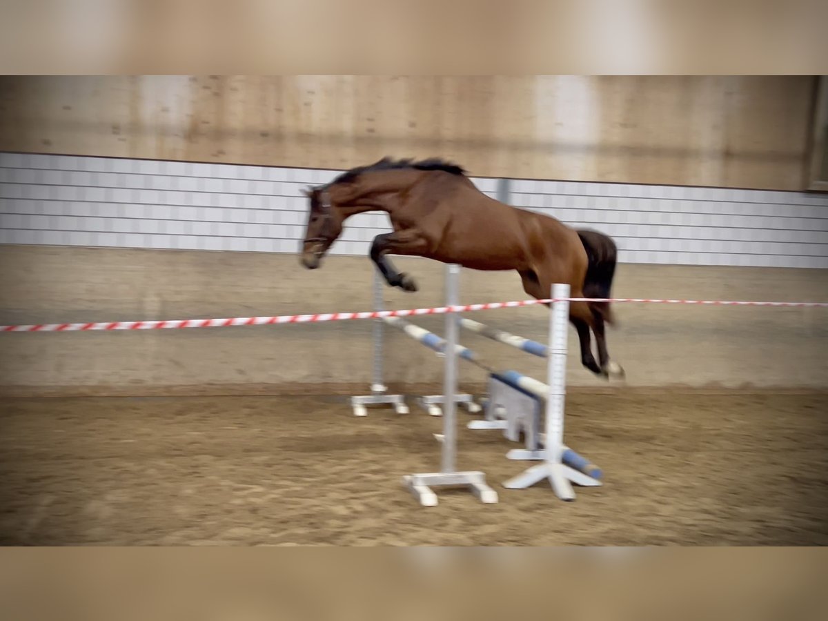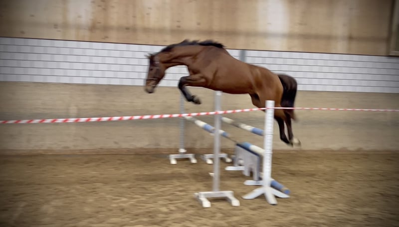 Lauriel Larimar × Caretino, foaled on May 28, 2022, Holsteiner gelding. He is currently being gently backed and can be seen in the video during his very first free jumping session. Holsteiner Olympic bloodline 741 (including Cardento, Leandro, Colorit, Click and Cash, Quintender, Coreandro). First free jumping and turnout in the arena and on the paddock. His dam is full sister to the 2018 licensed Holsteiner stallion Coreandro, who has competed successfully up to 1.45 m under Gerrit Flücken. His sire, Larimar, has produced several internationally successful offspring competing up to 1.60 m, including Lord Mexx, Larisal, Deleyn, and Ligretto.