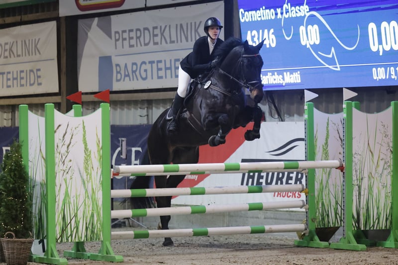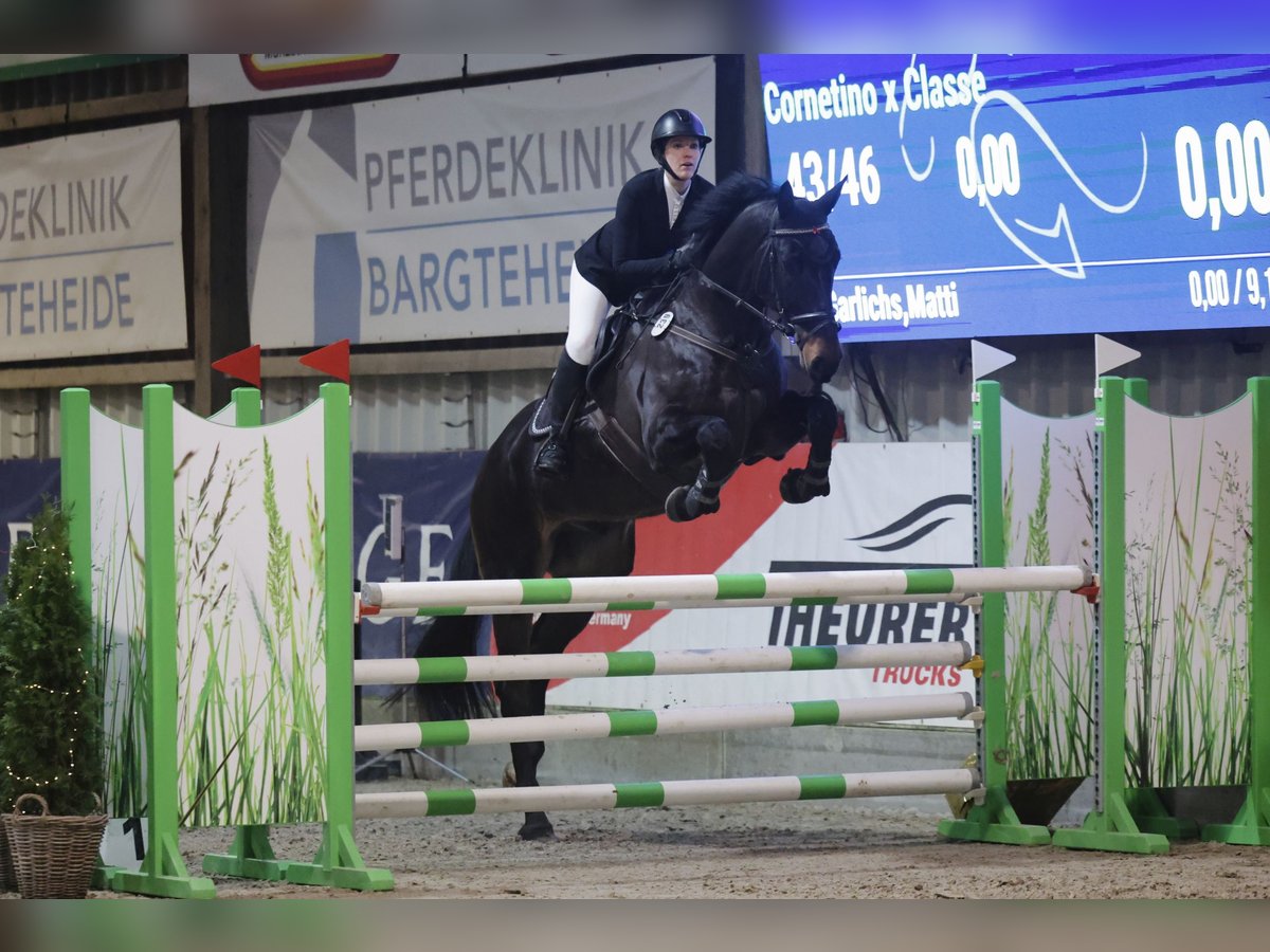 For sale: Holsteiner gelding with an elegant dark coat. Gently trained by an amateur, he has won at L-level show jumping and is placed in M-level competitions. He is forgiving of his rider’s mistakes, making him well-suited for riders moving up the ranks. He has no vices and is characterized by his calm and well-behaved nature on the ground. At competitions, he remains relaxed and focused, not easily spooked. The blacksmith, loading, and grooming are no problem. The cost for a trial ride is €30, which can be deducted if purchased.