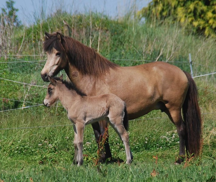 Heilla ist 2010 bei uns in D geboren und ekzemfrei. Sie wurde 5jährig angeritten und zeigte sich hier sehr einfach. Alle Gänge waren klar getrennt mit sicherem Trab und einfach zu reitendem Tölt bei gut mittlerem Temperament. Seither ist sie in der Zucht und hatte 8 Fohlen. Sie ist eine sehr gute Zuchtstute und Mutter, alle Geburten waren ohne Komplikationen, sie hat immer sehr viel Milch. Im Herdenverband nutzen die anderen Stute sie gerne als Fohlensitterin. Im Rang ist Heilla im Mittelfeld und kommt mit allen gut klar. Sie liebt Popo-kraulen. :-) Heilla ist erdfarben, rein Svadastadir gezogen (Feif ID DE2010210833) und vermutlich reinerbig Rappe. Alle ihre Fohlen haben gute Grundgangarten und viel Tölt. Besonders die Anpaarung mit Heljar frá Brekknakoti (letztes Foto) hat sich bewährt, von ihm ist sie auch tragend für 2026. Das ungeborene Fohlen ist im Preis inklusive. Sie erhielt schon mit ihrem ersten Fohlen bei Fuß die Verbandsprämie und ist im Stutbuch 1 geführt. Heilla war nie verletzt, ist aber leichtfuttrig und kann ohne Fohlen eher nicht 24/7 auf die Weide. Wir suchen für unsere Heilla und ihr Fohlen ein tolles Zuhause in artgerechter Haltung in der Gruppe mit Familienanschluss. Wir trennen uns nur schweren Herzens, da wir schon Töchter und Enkeltöchter haben, mit denen wir weiterzüchten möchten. Der Preis ist verhandelbar - Platz vor Preis.