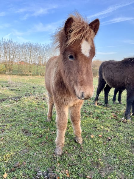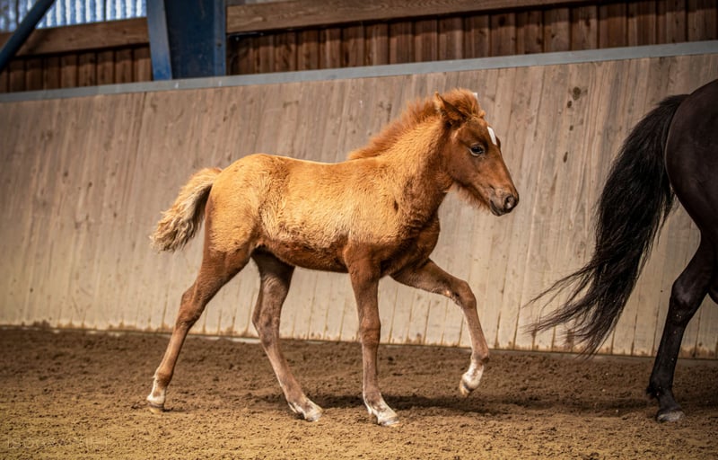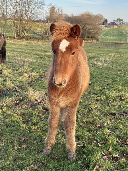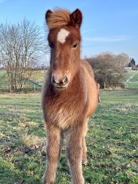 Orný ist am 29.6.25 bei uns geboren. Sie ist ein sehr feminines Stutfohlen mit endlos viel Naturtölt und feinen Reaktionen. Im Tölt zeigt sie eine große Tempovarianz. Je nach Wachstumsphase trabt sie aber auch. Sie zeigt sich derzeit im Kontakt zu Menschen eher zurückhaltend, wobei ihre Mutter als junge Stute genauso war, was sich von allein gelegt hat. Außer regelmäßige Wurmkurgaben, Umweiden, Mineralfutterversorgung und Hufe ausschneiden, machen wir nichts weiter mit unseren Fohlen, sie kommen alle früher oder später von alleine an und werden neugierig. Orný hat eine gute Abstammung: Ihr Vater ist der Elitehengst und mein WM-Pferd Ómi fran Stav (FIZO 8.29), dessen Nachkommen in erster Linie große, hünsche Pferde mit viel Behang, klarem Naturtölt und erstklassigem Charakter sind. Ihre Mutter ist eine junge Stute aus einer Eliteanpaarung: Ihre Mutter erhielt 8.28 Punkte und ihr Vater Akur frá Kagaðarhóli sogar stolze 8.63 Punkte. Orný erhilet bei ihrer Eintragung vom Pferdestammbuch die Fohlenprämie. Derzeit läuft sie noch mit ihrer Mutter bei Fuß, könnte aber jetzt abgesetzt werden und umziehen oder den Winter noch in ihrer Herde bleiben.