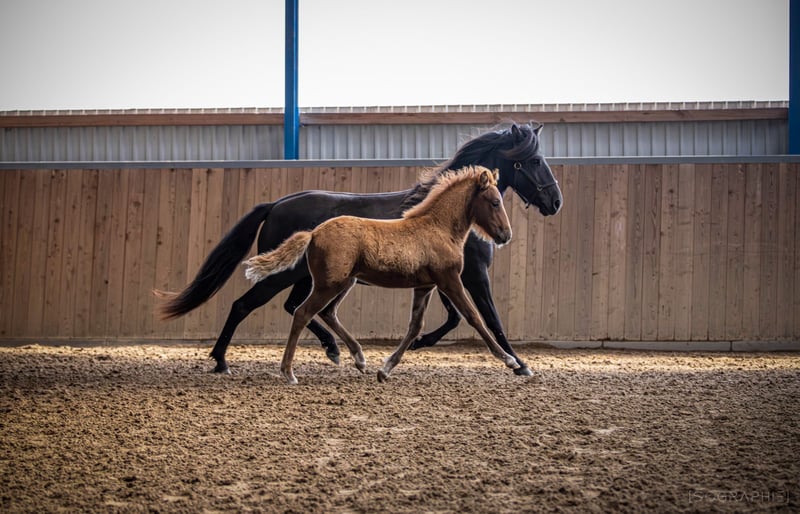 Orný est née chez nous le 29 juin 2025. C’est une pouliche très féminine, dotée d’un naturel abondant et de réactions fines. Lorsqu’elle trotte, elle montre une grande variation de vitesse, mais selon sa phase de croissance, elle peut aussi galoper. Actuellement, elle se montre plutôt réservée au contact des humains, ce qui est normal pour une jeune poulinière, sa mère ayant été également très timide à cet âge, ce qui s’est rapidement estompé. À part des vermifuges réguliers, la pâture en liberté, la supplémentation minérale et la ferrure, nous ne faisons rien d’autre avec nos poulains. Tous finissent par venir vers nous d’eux-mêmes et deviennent curieux. Orný possède une bonne origine : son père est le étalon d’élite et mon cheval de championnat du monde, Ómi fran Stav (FIZO 8.29), dont la descendance se compose principalement de grands chevaux élégants, avec beaucoup de crin, un naturel clair et un caractère exceptionnel. Sa mère est une jeune jument issue d’une saillie d’élite : sa mère a obtenu 8.28 points, et son père, Akur frá Kagaðarhóli, a même reçu 8.63 points. Lors de son inscription au stud-book, Orný a reçu la prime pour poulinière. Elle est encore en liberté avec sa mère, mais pourrait être séparée et déplacée ou rester dans son troupeau pour l’hiver.