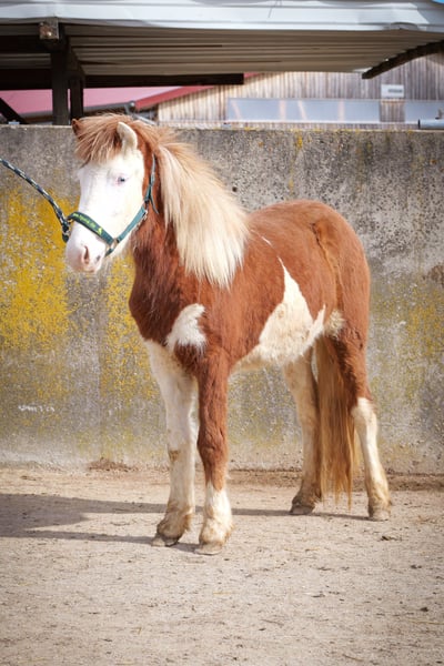Mósaík ist 2024 bei uns in D geboren und eine auffallend gezeichnete Helmschecke mit einem weißen Ohr. Sie hat eine sehr gute Abstammung, ihr Vater ist Jaguar fra Teland (1,51m) und die Mutter (1,38m) von Kvistur frá Skagaströnd. Altersgemäß ist sie noch roh, aber regelmäßig entwurmt, geimpft, dem Hufschmied vorgestellt und natürlich mit Mineral versorgt. Sie ist freundlich, kuschelt gerne und bleibt auch liegen, wenn man sich dazu setzt zum knuddeln. Artgerecht wächst sie im Herdenverband auf und ist immer unter den ersten, die zu einem kommen. Mosaik zeigt Trab und viel Tölt und ist sicher nicht nur als späteres Reitpferd, sondern auch für die Zucht interessant. Die Fotos sind aktuell und von den Eltern. Videos gibt es derzeit keine.