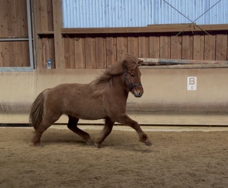 Vif von Möllenbronn is a friendly, five gaited, 3 year old young Fuschfalst mare. She has a very good pedigree. Her sire is LK1 in tölt, five gaits and pass and is himself elite tested. He is a son of Hrannar frá Flugumyri. Vif's dam ran successfully LK2 in sport (V1 and T1) with individual scores up to 7.0 for tölt, walk and trot. Vif is cooperative and friendly to handle. She is very uncomplicated in the herd. She shows all gaits with good ground coverage. Vif is growing up in a herd of young mares. She is regularly vaccinated and wormed. Foal test: Exterior: 7.8 Interior: 7.9 Gaits: 7.9 Overall: 7.87 Judges' verdict: Self-confident, well-built foal with lots of natural tölt and good gait distribution, energetic hindquarters, lots of speed and clear race passages