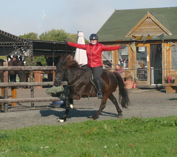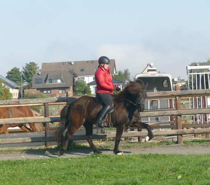 ✨ Charakter, Gänge & Ausstrahlung in Vollendung! ✨ Sörladis von Roderath *2020 / 140 cm Diese hübsche und elegante Rappstute erobert jedes Herz im Sturm! Mit ihrem offenen, freundlichen Wesen und ihrer großen Arbeitsfreude ist sie nicht nur ein Pferd zum Reiten – sie ist ein echter Partner fürs Leben. 💎 Gangarten zum Verlieben Tölt: Immer taktklar, butterweich, leichtfüßig – ob mit lockeren Zügeln oder in schöner Anlehnung, sie lädt zu endlosen Ritten ein. Trab: Elegant und klar getrennt vom Tölt– ein Bild voller Ausdruck. Galopp: Sicher, nicht zu schnell und täglich besser bergauf! Schritt: Gelassen, schreitend und zuverlässig – ideal für entspannte Ausritte. 🌿 Verlasspferd im Gelände Ob alleine oder in der Gruppe, vorne, mittig oder hinten – sie geht überall souverän mit. Verkehr, Züge, LKWs, Hunde oder Wasser? Kein Problem! Sie kennt alles und bleibt dabei immer ruhig und zuverlässig. 🎓 Ausbildung & Reiteigenschaften Trotz ihres Alters ist sie bereits hervorragend ausgebildet: fein an den Hilfen, leicht in der Hand, extrem rittig. Schenkelweichen, Schulterherein – für sie eine Selbstverständlichkeit. Ein Pferd, das auch anspruchsvolle Reiter begeistert und dabei immer Spaß macht. 💖 Das gewisse Etwas Diese Stute vereint Schönheit, Charme, tolle Reiteigenschaften und Verlässlichkeit. Wer sie einmal erlebt hat, wird sie nicht mehr missen wollen – ein echtes Herzenspferd, das jeden Tag Freude schenkt. 👉 Suchst du ein Islandpferd, das Charakter, Qualität und Freude am Reiten perfekt verbindet? Dann ist diese Stute dein absoluter Hauptgewinn!