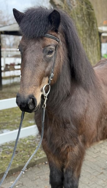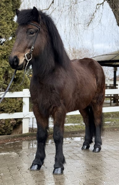 Gleði Stute, 1,41m groß *2020 in Deutschland viergängig geritten bisher Dunkelbraune ohne Abzeichen ekzemfrei, gesund, beschlagen, geimpft, entwurmt V: Myrkvi vom Kronshof 8,31 (Ext 8,27 Re 8,33)‼️ VV: Óðinn vom Habichtswald 8,79 (Ext 8,46 Re 9,02)‼️ M: Gersemi von Hagenbuch MV: Lykill frá Blesastöðum 8,30 (Ext 8,20 Re 8,36)‼️ Gleði ist eine harmonisch gebaute Stute, aus deutscher Zucht, mit einer Abstammung, die sich für Züchter wie ein Märchenbuch liest. In Ihrer Blutlinie finden sich die bekanntesten Hengste und Stuten der Islandpferdezucht. Nicht nur für die weitere Zucht macht sie das interessant. Die hohen Reiteigenschaftsnoten Ihrer Vorfahren lassen auf dem Papier schon erahnen was ein tolles Reitgefühl Gleði dem Reiter gibt. Ihre Gänge sind klar getrennt, von guter bis sehr guter Qualität und zeigen ansprechende Bewegung. Sie ist im Gelände, auf der Bahn und in der Halle gleichermaßen entspannt zu reiten, dass es eine pure Freude bereitet, dieses Pferd arbeiten zu dürfen. Ihr Charakter ist aus Gold, ihre Nerven aus Stahl und das macht sie auch für die Jugend zum perfekten Begleiter auf vier Hufen. Man könnte ein Pferd wie Gleði wohl als die "eierlegende Wollmilchsau" beschreiben, denn mit ihr stehen einfach alle Türen offen. Zucht, Sport, Freizeit, Trainerscheine und Kurse sind mit ihr möglich. Sie zeigt ein Talent für Dressurlektionen und läuft aufgrund ihres vorteilhaften Gebäudes fast von allein in Haltung. Im Umgang ist sie höflich, unkompliziert und dem Menschen sehr zugewandt. Streicheleinheiten beim Putzen findet sie klasse und genießt die Aufmerksamkeit sichtlich. Wer diese tolle Stute kennenlernen und probieren möchte, kann dies gerne bei uns in A-5221 Lochen am See tun.