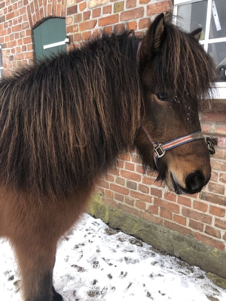 Árrós ist eine auffallend hübsche Stute mit langer Doppelmähne und einem stabilen Fundament, gesund und Scheckheft gepflegt. Sie kommt direkt aus 1. Hand, wurde von mir (IPZV-Trainer B) gezüchtet und nach der Grundausbildung im Rahmen der IPZV-Jungpferdebereiterprüfung schonend und sorgfältig ausgebildet. Beide Eltern sind Elitegeprüft: Ihr Vater ist der im Norden beliebte Vererber Vördur frá Arbae , der erfolgreich in Kinderklasse gestartet ist, was für den einwandfreien Charakter spricht. Die Mutter Árdis frá Kollaleiru war unsere Stammstute, die uns sehr viele schöne Reitpferde gebracht hat. Árrós bringt eine vielseitige Eignung mit: Sie hat 5 absolut klar getrennte Gänge, der Tölt ist ganz einfach zu reiten (auch für Umsteiger gut geeignet), der Schritt ist schreitend und entspannt, der Trab sehr sicher mit weiten Bewegungen, der Galopp braucht aktuell kräftebedingt etwas Tempo für die Balance, der Pass ist getestet und leicht abrufbar, aber nicht trainiert. Sie verfügt über eine stets hübsche Form, sehr gute Reaktion auf Reiterhilfen, ohne übersensibel zu sein. Ihr Temperament ist angenehm mit gutem Vorwärts, dabei unerschrocken und immer regulierbar (auch ohne Zügel über den Sitz). Sie beherrscht alle gängigen Dressurlektionen und Seitengänge. Im Gelände läuft sie unkompliziert alleine oder mit anderen, kennt dabei alles, was einem draußen begegnen kann und ist durch die nahe Bundesstraße hier besonders verkehrssicher. Sie war bereits sehr souverän auf Kursen unterwegs, auch einen Einsatz im Sport kann ich mir gut vorstellen. Durch die bewährte Abstammung eignet sich Árrós auch besonders für die Zucht. Im letzten Jahr hatte sie bereits ein schickes Fohlen, dabei eine unkomplizierte Trächtigkeit, Geburt und Mutterschaft. Seit dem Absetzen Anfang des Jahres wird Árrós wieder geritten. Besucht uns gerne - vielleicht kombiniert mit einem Trip an die nahe Ostsee. Árrós kann hier in der Halle und im Gelände ausprobiert werden. Preis steigt bei weiterem Training
