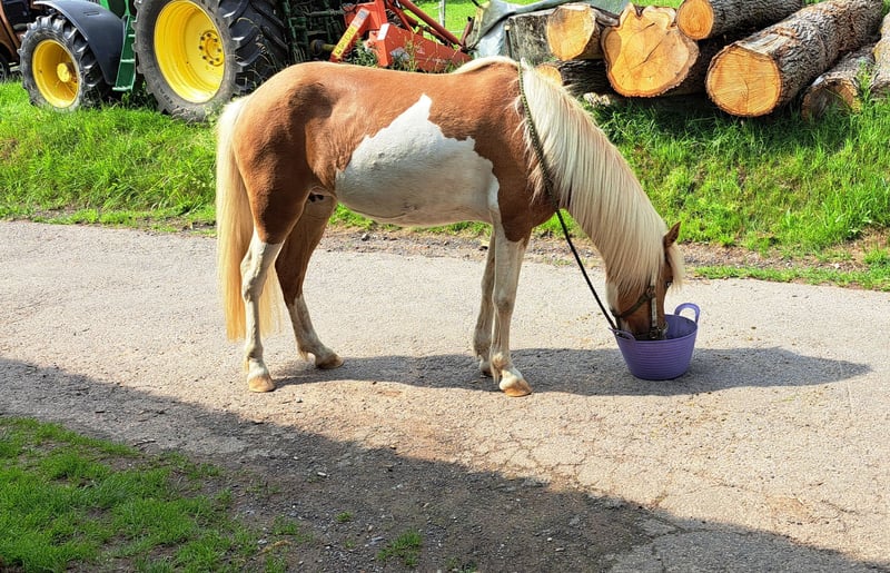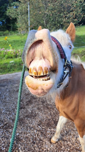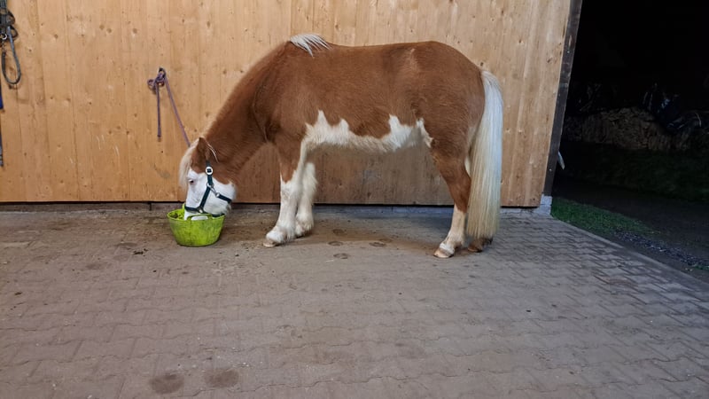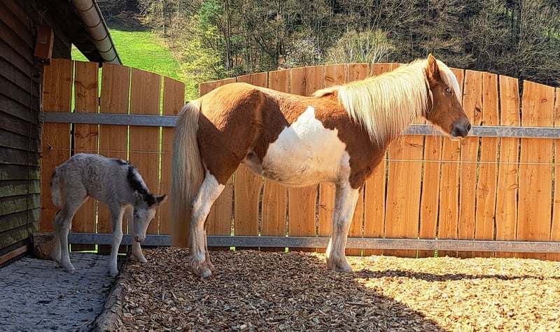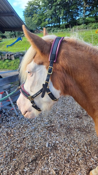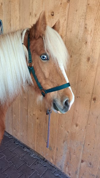 Frökk ist eine eingetragene und gekörte Zuchtstute im Stutbuch 1 und ist ein Fuchs-Helmschecke. Sie hatte insgesamt 3 tolle Fohlen. Ihr letztes Stutfohlen kam im April 2025 zur Welt, eine schicke Graufalbhelmscheckstute mir Creme. Sie ist am 30.05.2018 geboren und wurde schonend Anfang 2025 von mir angeritten. Sie geht super brav alleine ins Gelände und ist auch sehr unerschrocken. Wanderer, Hunde, Flatterband oder Waldmaschienen sind für sie kein Problem. Momentan läuft sie noch gebisslos am Kappzaum und das super fein. Die Gewöhnung ans Gebiss habe ich jetzt begonnen, ist aber ganz unspektakulär. Sie macht super arbeitswillig in der Bodenarbeit mit. Sie kennt Longieren, Equikinetik, Stangenarbeit, Freiarbeit. In der Handarbeit kennt sie Schulterherein, Schenkelweichen und übertretende Volten. Sie kann auch sehr gut Schenkelweichen auf einen zu, was ich gerne zum Aufsteigen nutze. Paar kleine Tricks kann sie auch. Als Handpferd läuft sie sehr gut mit. Sie hat einen angenehmen flotten Schritt und einen tollen ausdrucksstarken Trab mit viel Aktion. Tölt ist unter dem Sattel gut abrufbar, sie braucht da generell noch mehr Kondition und Kraft Sie steht bei mir im Offenstall und ist sehr sozial und verträglich. Im Winter bekommt sie all you can eat Heu und im Sommer steht sie 24h auf der Wiese. Sie wurde regelmäßig geimpft, entwurmt und die Hufe gemacht. Sie läuft hier sehr gut barfuß. PSSM/MIM negativ Zähne erst frisch gemacht. Sie wird vermehrt von mir vom Boden gearbeitet, da ich das Gefühl habe ich wäre zu groß und zu schwer für sie. Ich suche für sie ein schönes Zuhause, wo sie im Mittelpunkt stehen kann und vielleicht vielseitig ausgebildet werden kann. Sie ist bei mir sehr gesprächig und begrüßt einen immer. Frökk ist eine ganz liebe, sensible Stute, trotzdem noch ein Jungpferd. Du solltest dich mit der feinen Hilfengebung auskennen, da ich meine Pferde sehr fein und leise ausbilde. Wenn sie dir das Interesse geweckt hat melde dich gerne, auch gerne per Whats App 015757999782